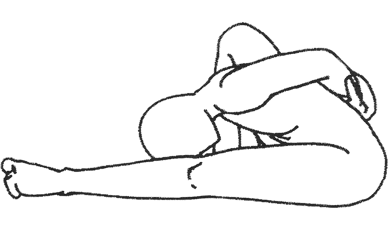 S’asseoir longuement. Plier une jambe et en placer le pied près de l’autre cuisse, genou levé. Croiser les mains dans le dos, les bras entourant le genou levé et se pencher en avant pour toucher de la tête le genou de la jambe tendue. |