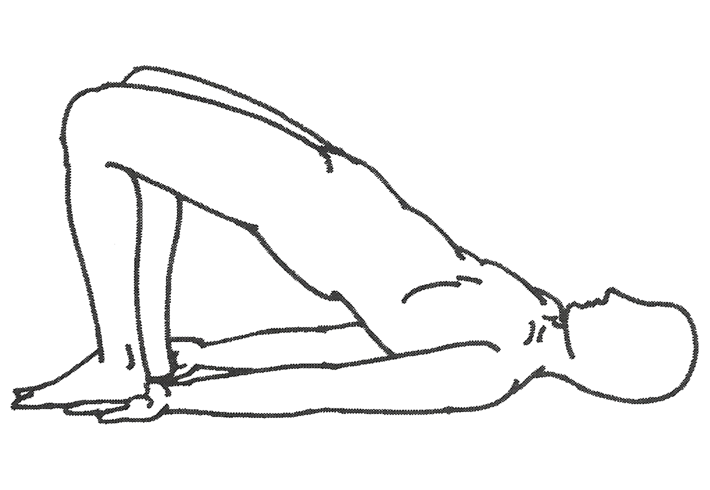 Variante n°1 : S’allonger sur le dos. Plier les genoux et rapprocher les talons des fesses. Insérer les paumes des mains tournées vers le haut entre le sol et les pieds. Lever le ventre vers le ciel. |