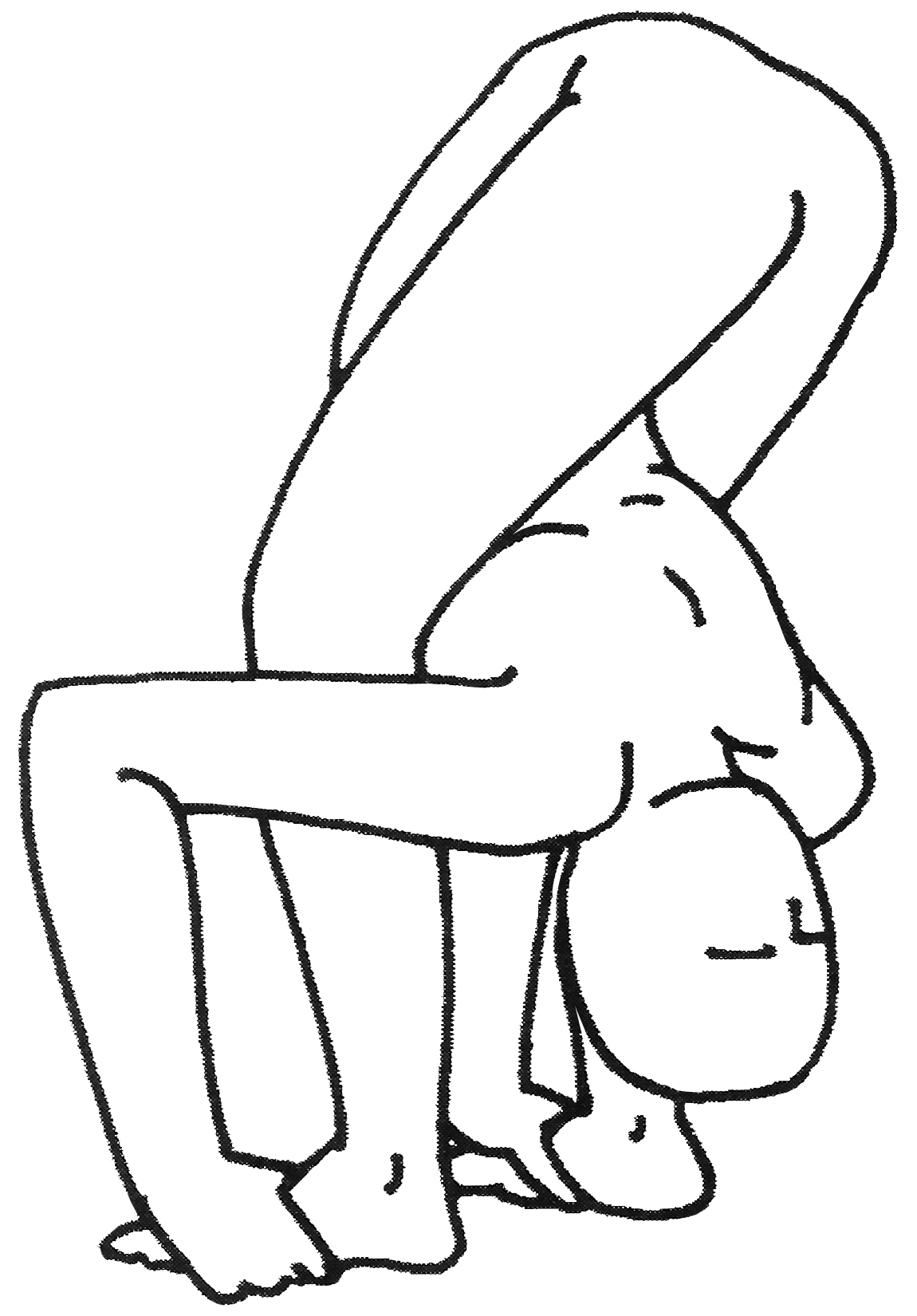 Variante n°2 : Se tenir debout jambes légèrement écartées. Se pencher en avant et passer la tête et les épaules entre les jambes. Saisir les orteils avec les mains par derrière. |