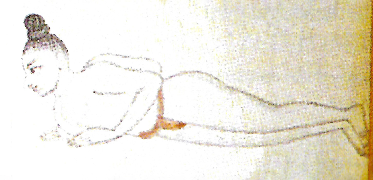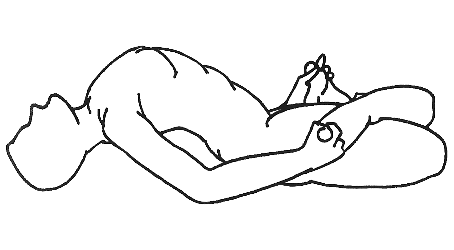 Variante n°2 : Comme pour la variante n°1, se mettre en position du lotus sur le dos. Puis mettre la tête en arrière en levant la poitrine et les épaules. Tenir fermement les pieds avec les mains. |