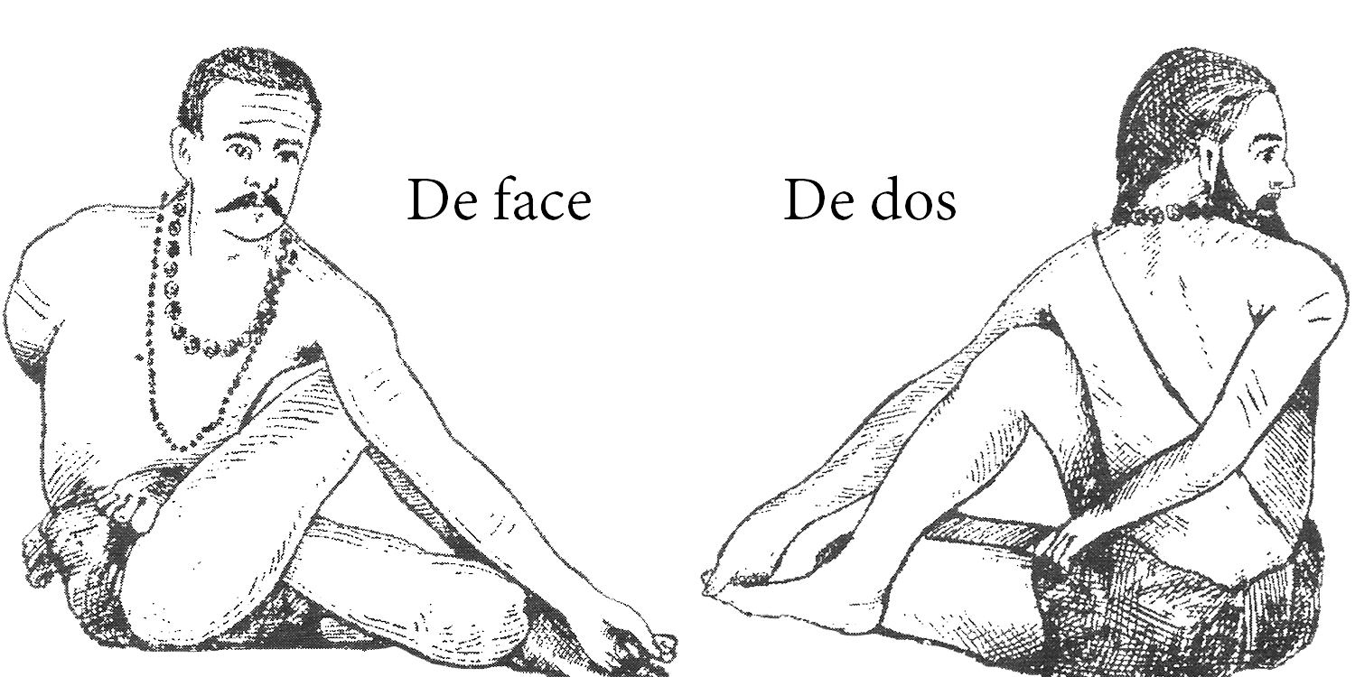 Variante n°4 : Placer le pied droit à la base de la cuisse gauche. Placer la main droite sur la cuisse gauche, le bras dans le dos. Placer le pied doit près du genou gauche. Le bras gauche passe devant le genou doit et la main attrape les orteils. Cette posture est aussi appelée matsyendrāsana (variante n°1). |