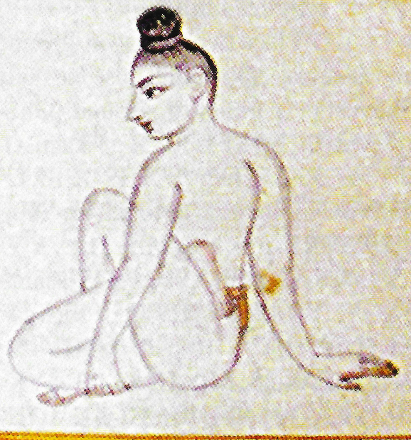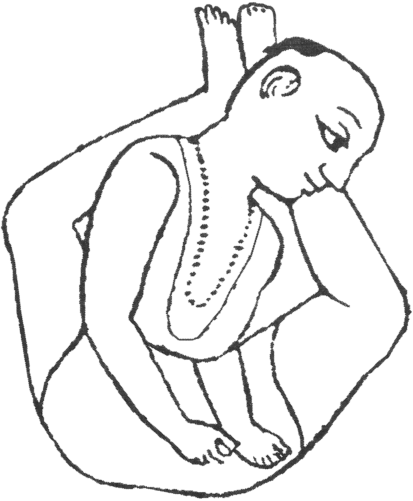 Variante n°3 : Assis, tirer les jambes vers les épaules et les croiser. Fermer les mains en poings et placer le poing droit sur le gauche. Cette posture s’appelle aussi macchandra-āsana. |