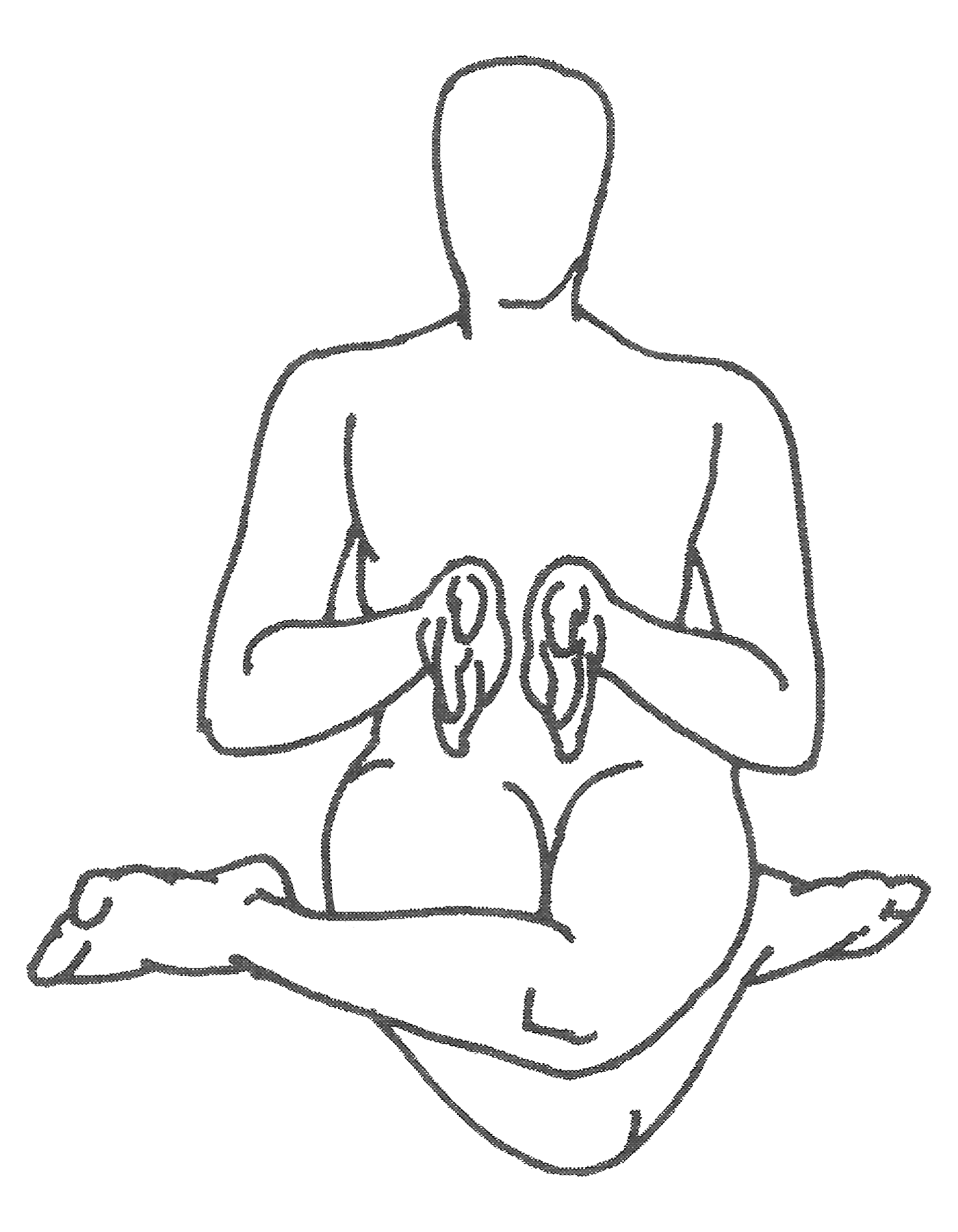 Assis, placer le pied droit sur le côté gauche et le pied gauche sur le côté droit. Positionner les mains de façon à imiter deux gazelles face à face. |