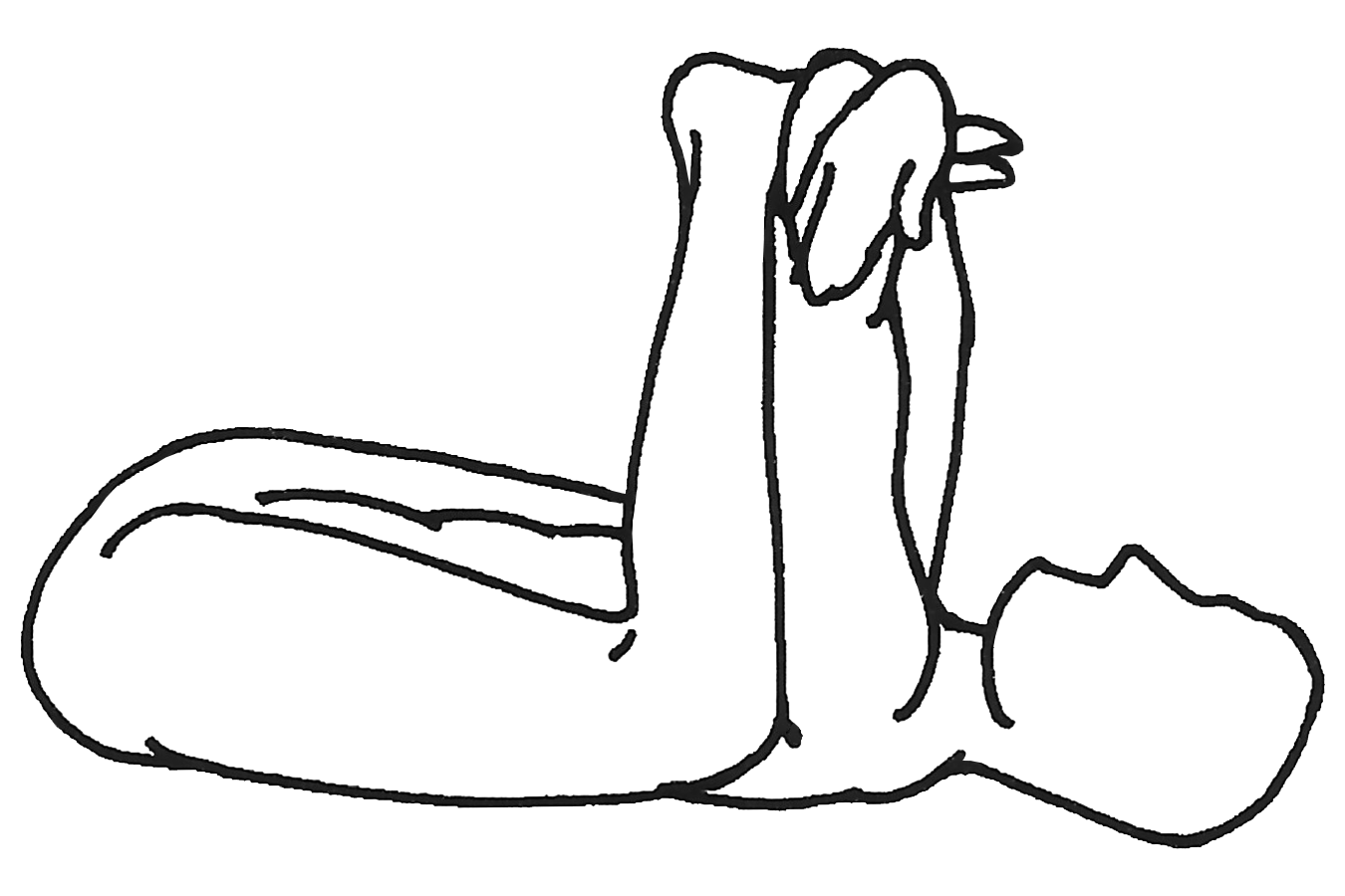 S’allonger sur le dos. Plier les jambes et venir coincer les genoux sous les aisselles. Saisir les pieds, tenus verticalement, par les mains. |