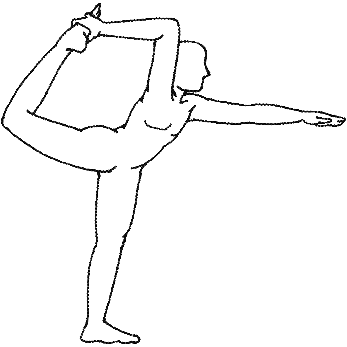 Se tenir sur une jambe. Courber l’autre jambe par derrière, en agripper les orteils avec la main correspondante par dessus la tête et lever la jambe. Tendre l’autre bras devant horizontalement. |