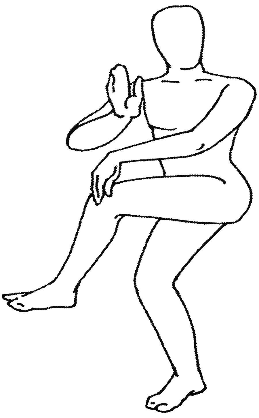 Imiter Shiva dansant (mais avec deux bras !) : debout sur la jambe droite, plier la jambe gauche devant et la surélever. La main gauche est devant le genou droit et la main droite tourne la paume vers l’avant. |
