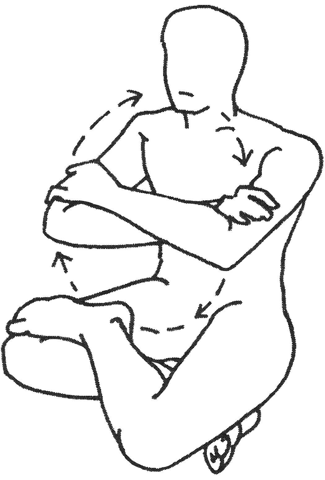 Assis, placer la cheville gauche sur le genou droit et la cheville droite sous la cuisse gauche. Saisir des mains les bras opposés près des épaules. Tourner les bras lentement, comme dans une baratte. Diriger le regard sur le nez. |