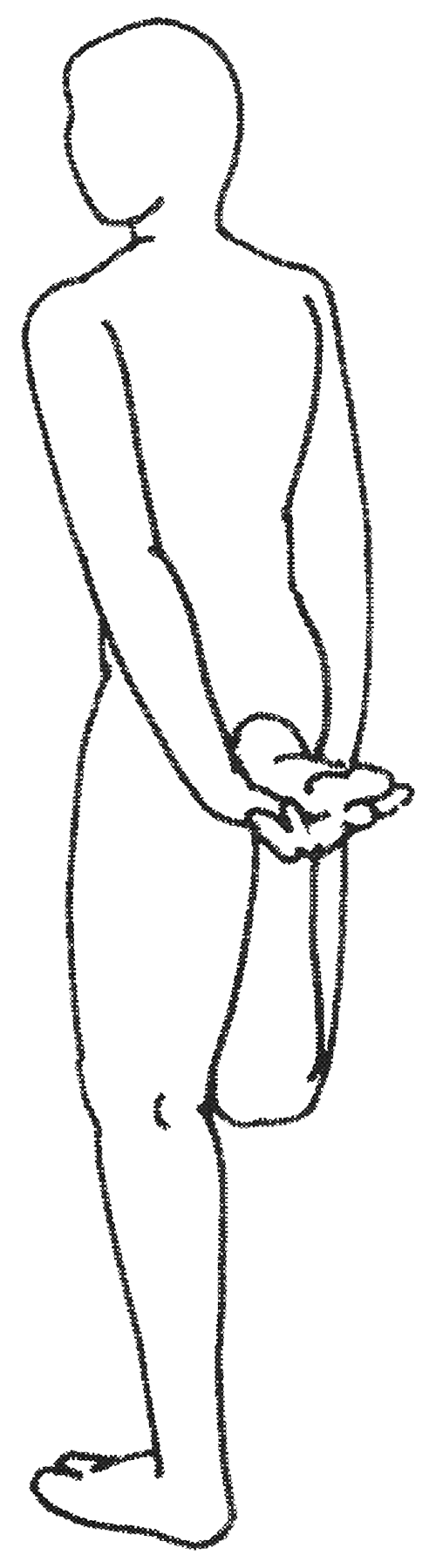 Se tenir debour sur une jambe. Tenir l’autre par derrière avec les mains. |