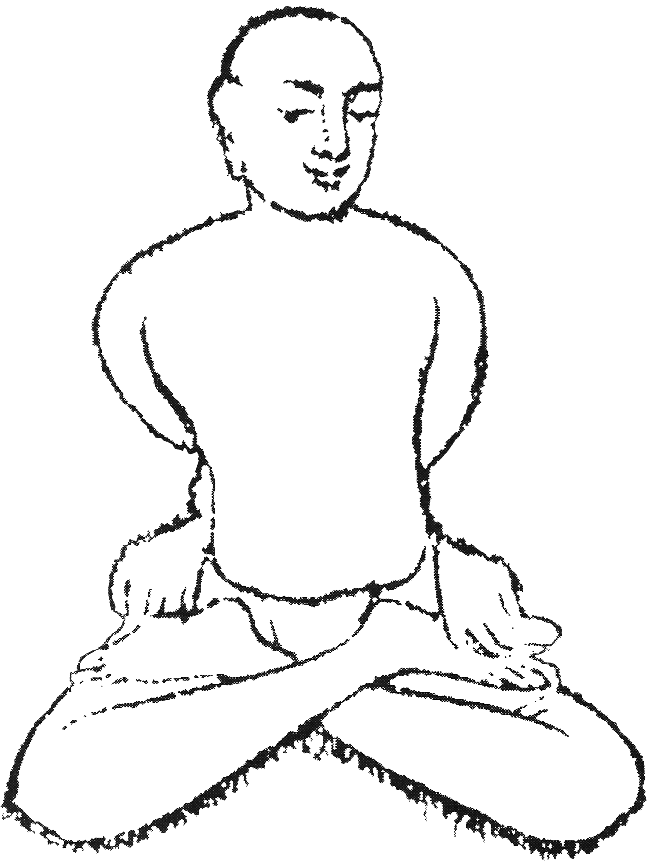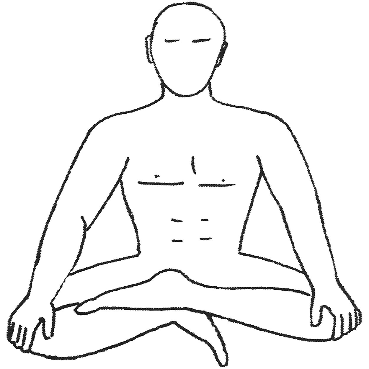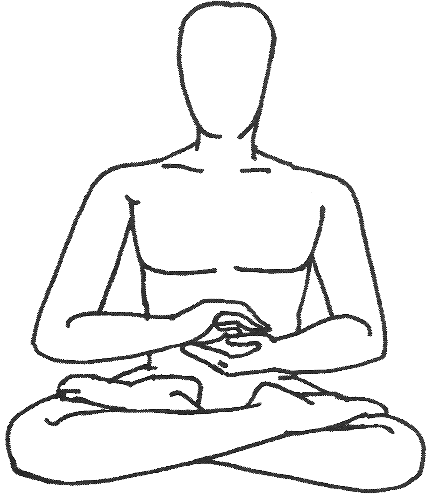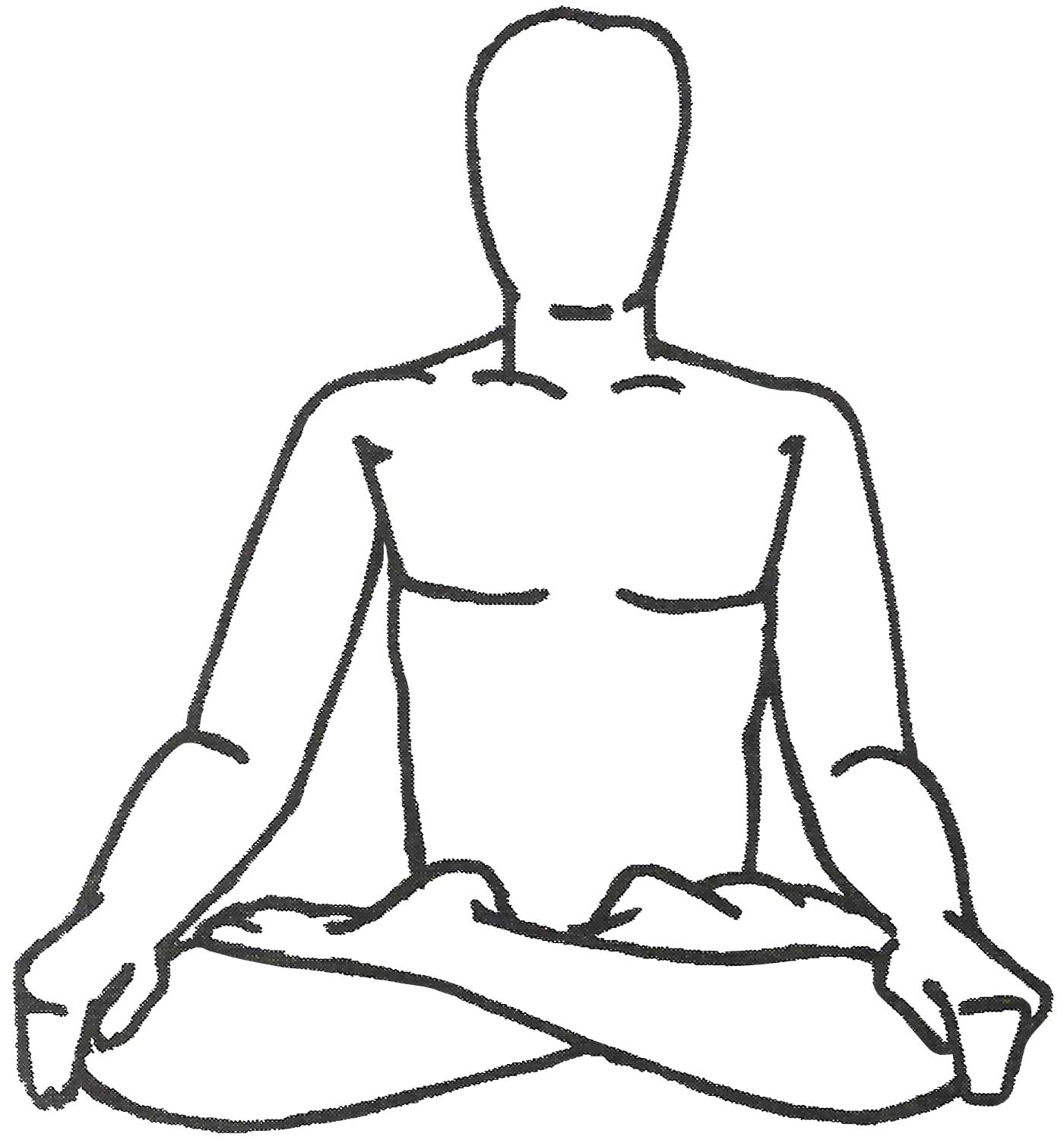 Variante n°3 : Dans cette posture, le pied gauche est d’abord placé sur la cuisse droite, puis le pied droit par-dessus. La paume des mains, tournée vers le ciel est placée sur le giron. |