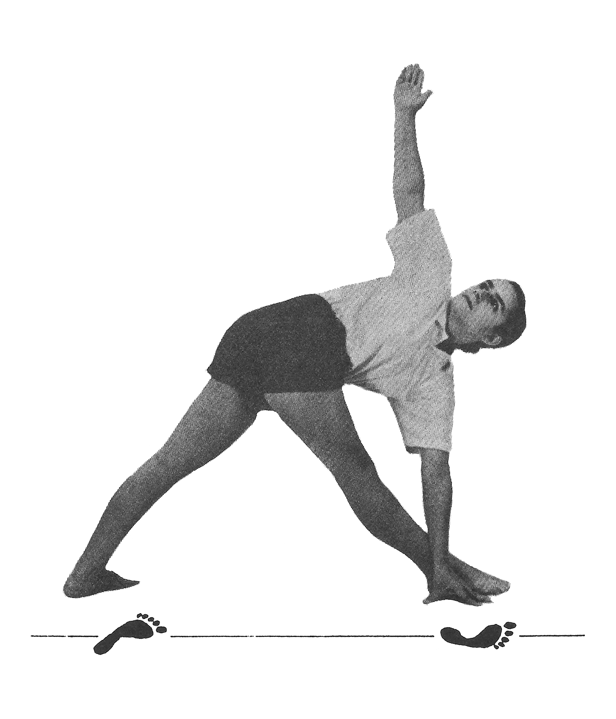 Se tenir debout (tāḍāsana), les mains le long du corps. Sauter et écarter les jambes d’environ 1 m en écartant aussi les bras à l’horizontale, paumes tournées vers le bas. Tourner le pied droit de 90° et le pied gauche de 45°. Tourner le buste, poser la main gauche à terre près du pied droit et tendre le bras droit à la verticale. Recommencer dans la position miroir. |
