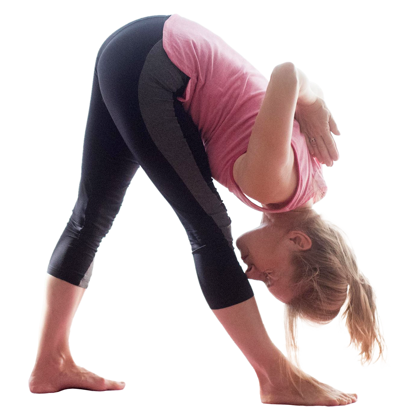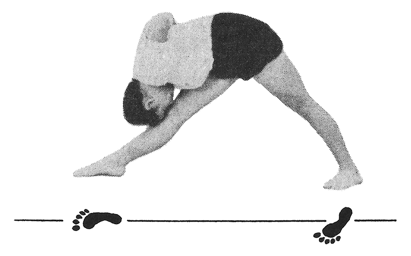 Se tenir bien droit (tadāsana). Joindre les mains en salutation dans le dos. Sauter sur place et écarter les jambes d’environ 60 cm. Tourner le pied droit de 90° vers l’extérieur et le pied gauche de 45° vers l’intérieur. Tourner le buste vers la droite et la tête vers l’arrière. Puis se pencher en avant jusqu’à toucher le genou droit avec la tête. Recommencer dans la position miroir. |