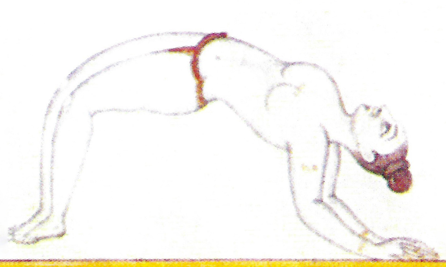 Variante n°3 : Allongé sur le dos, plier les jambes et placer les pieds sous les fesses. Reposer les mains près du nombril. Autre nom : paryaṅka bandha. |
