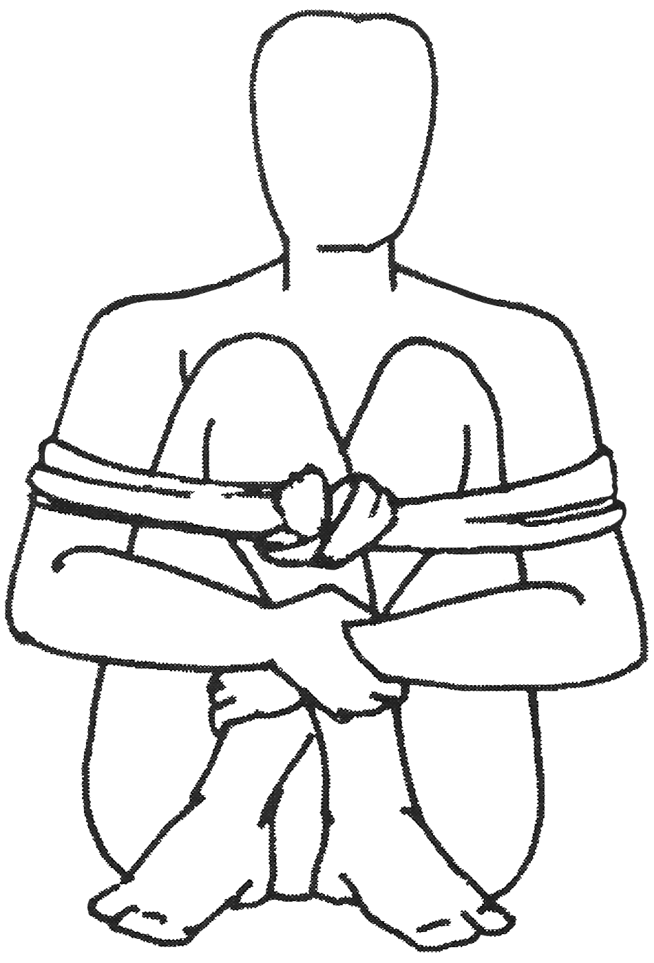 Variante n°2 : Assis, plier les genoux et croiser les jambes ; le pied droit est devant la cuisse gauche et vice-versa. Entourer les genoux et le dos d’un lien en tissu. Autre nom : yoga paṭṭāsana. |
