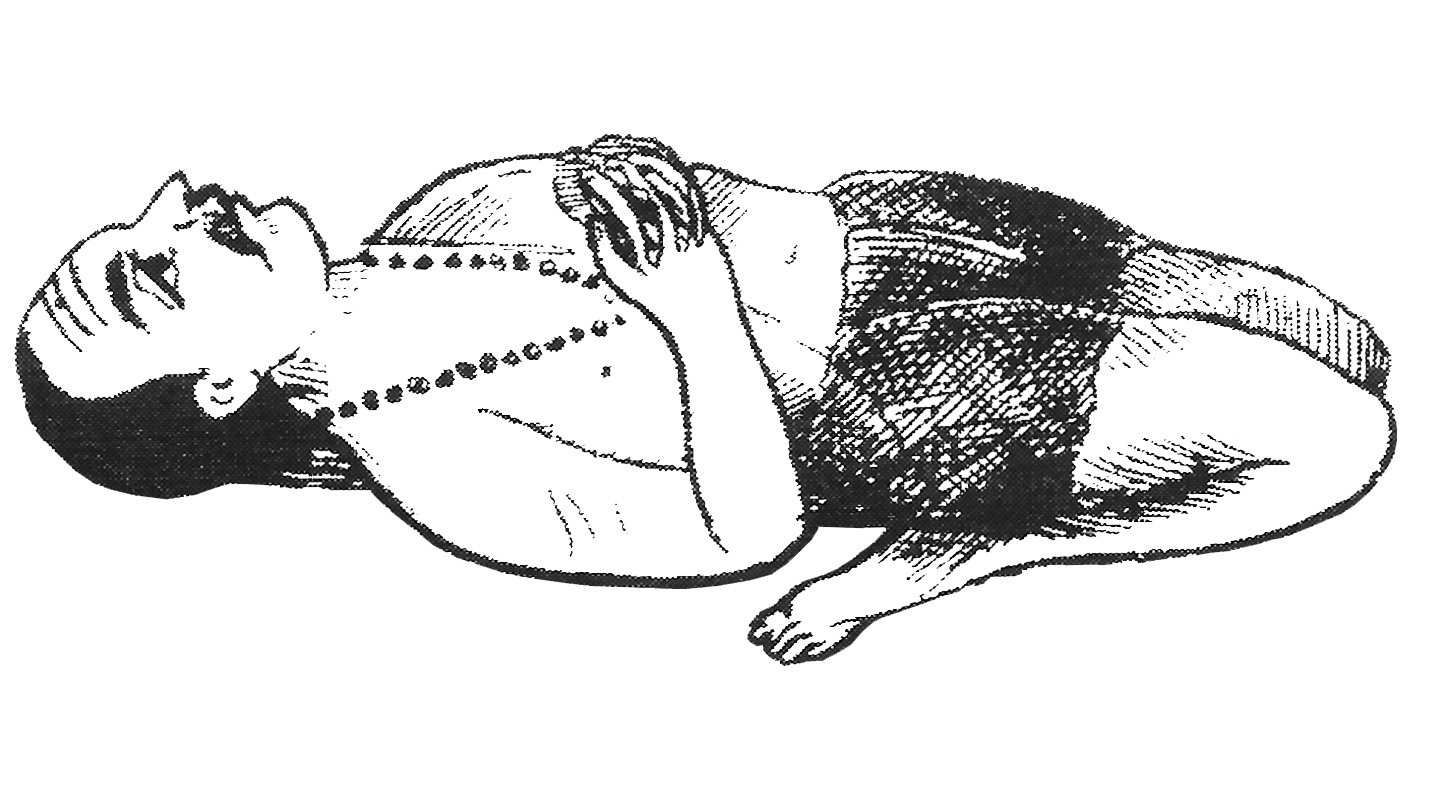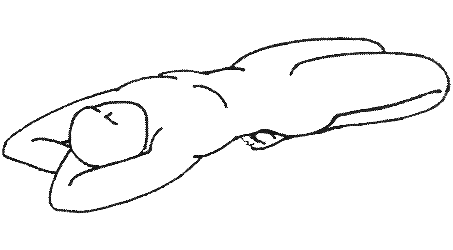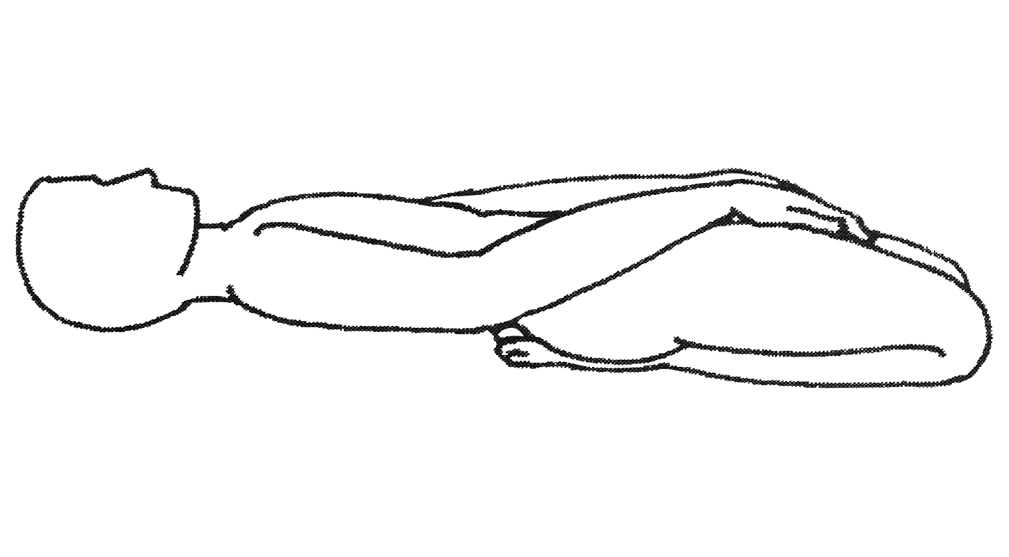 Variante n°4 : Même position des jambes que pour la variante n°3, mais ici les mains, sur lesquelles on se repose, sont croisées derrière la tête. |