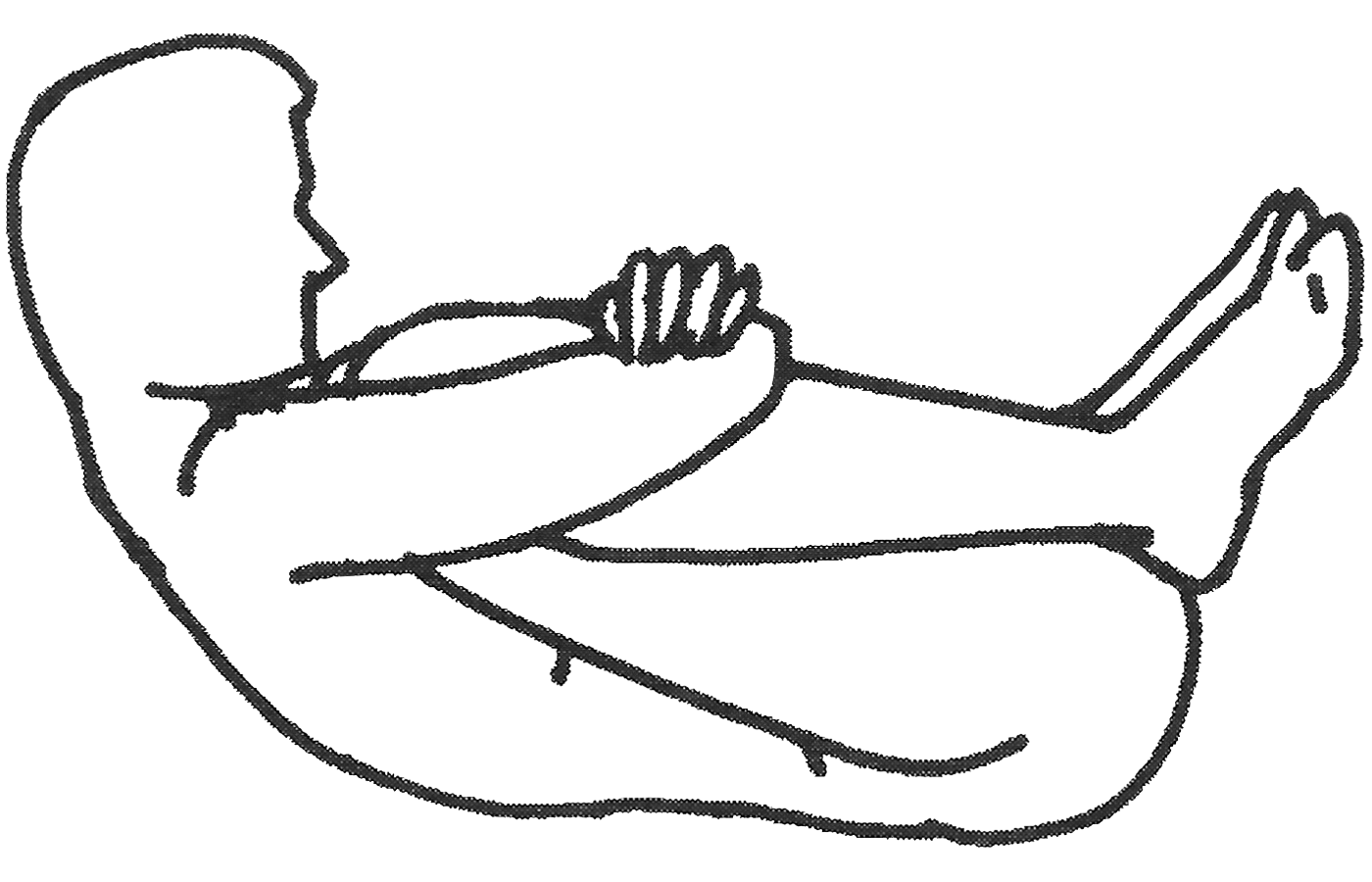 Variante n°1 : S’asseoir sur les fesses. Approcher les talons du périnée, en gardant les genoux levés. Entourer les genoux des deux bras et les presser contre la poitrine. |