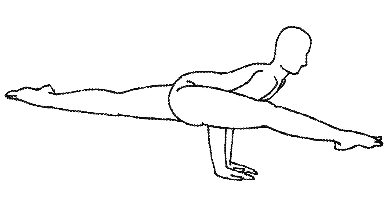 Les paumes des mains à plat sur le sol, placer les coudes de part et d’autre du nombril et soulever le corps comme un bâton parallèlement au sol. Étirer une jambe vers l’avant et l’autre vers l’arrière, « comme un paon ». Autre nom : mayūrāsana (variante n°6). |