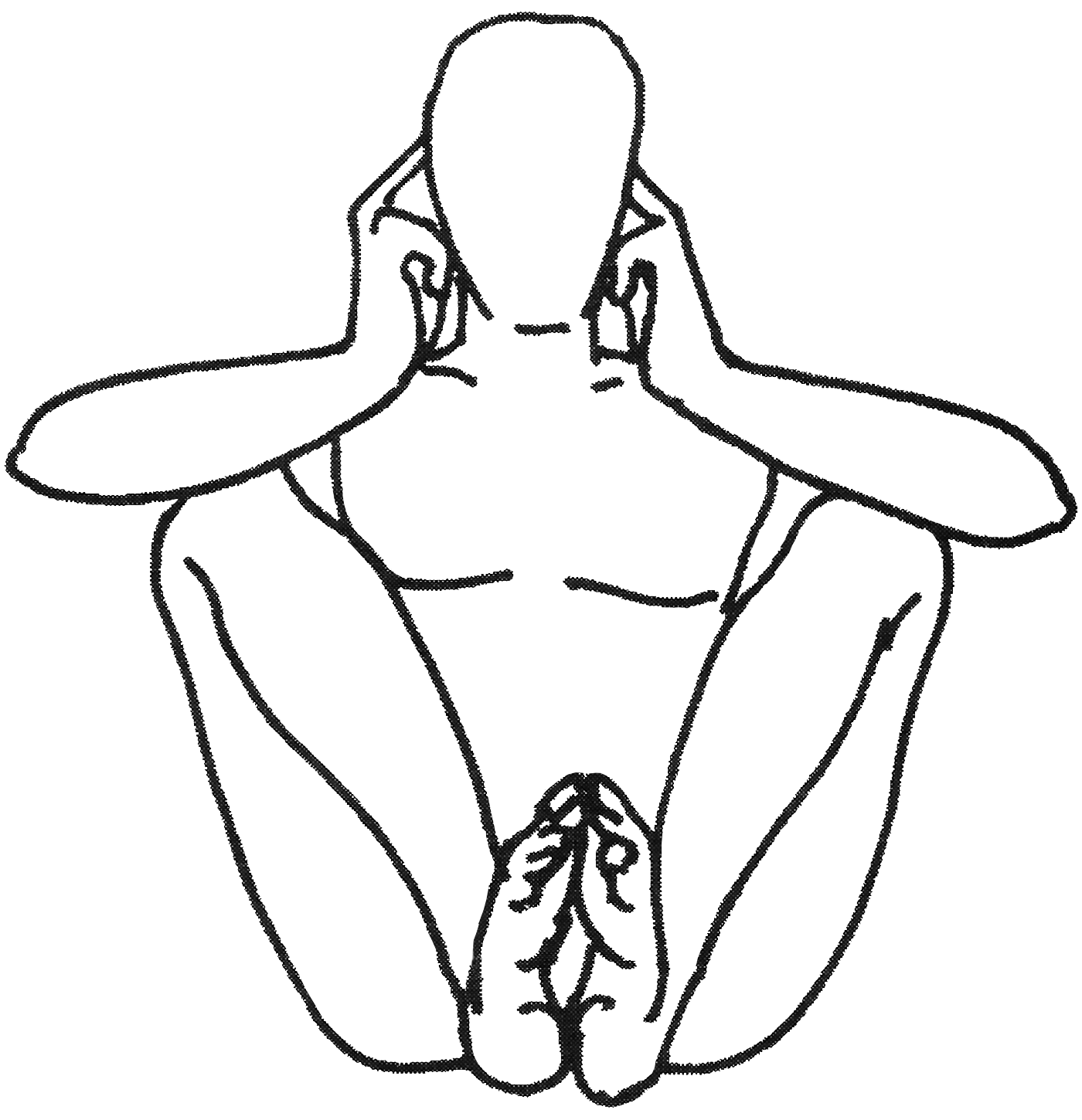 Variante n°1 : Se tenir sur les orteils en joingant les pieds. Placer les talons sous l’anus et écarter les genoux. Tenir les oreilles par les pouces et index. Boucher les oreilles à l’aide des auriculaires et annulaires. Adopter jālandara bandha1 et fixer le regard au niveau des sourcils. |