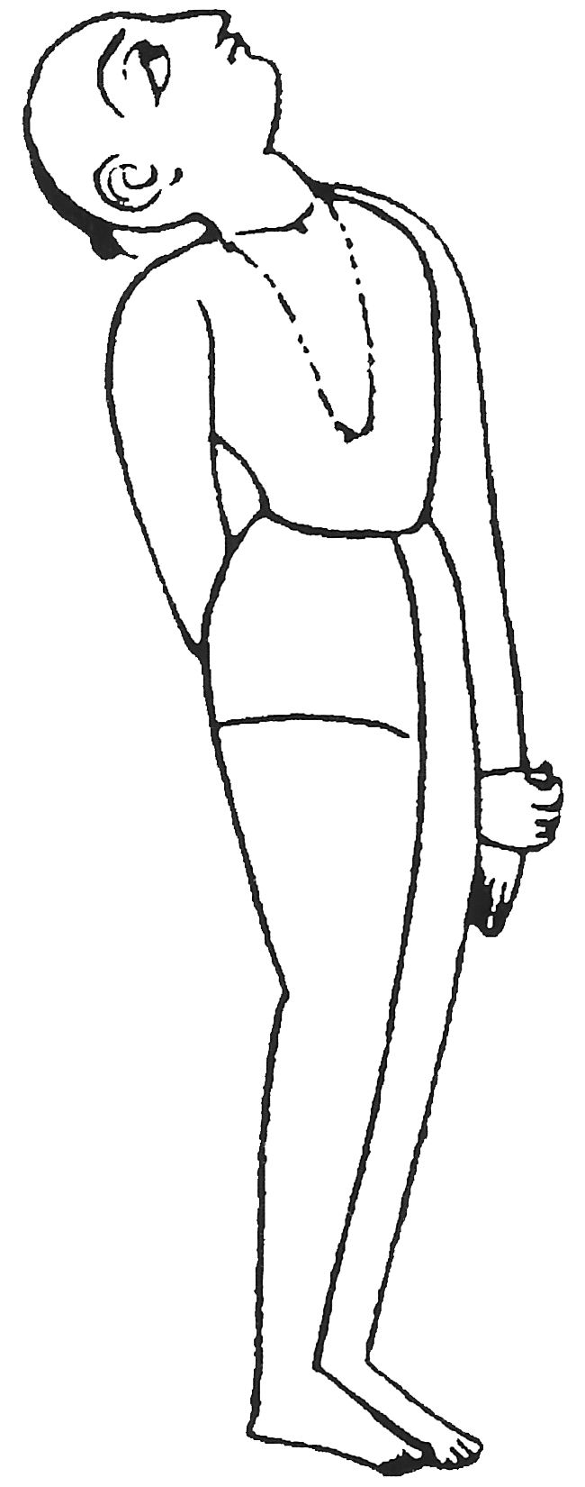 Se tenir debout les pieds joints. Passer la main droite dans le dos et agripper le poignet gauche à hauteur de la cuisse. Sans plier les genoux, pencher la tête vers l’arrière le plus possible et diriger le regard entre les sourcils. |