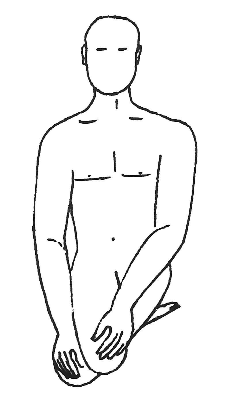 Variante n°1 : S’agenouiller, puis entourer la jambe gauche de la jambe droite. Les paumes des mains reposent sur les genoux respectifs. |