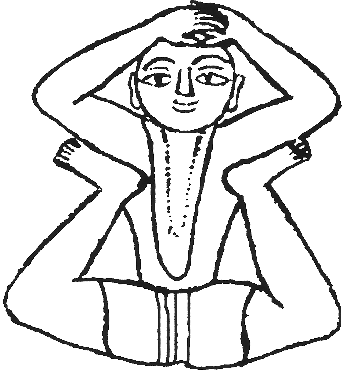 Assis, lever les deux pieds et les coincer sous les aisselles, plantes vers le haut. Bloquer les doigts et placer les mains sur la tête. Diriger le regard vers le bout du nez. |