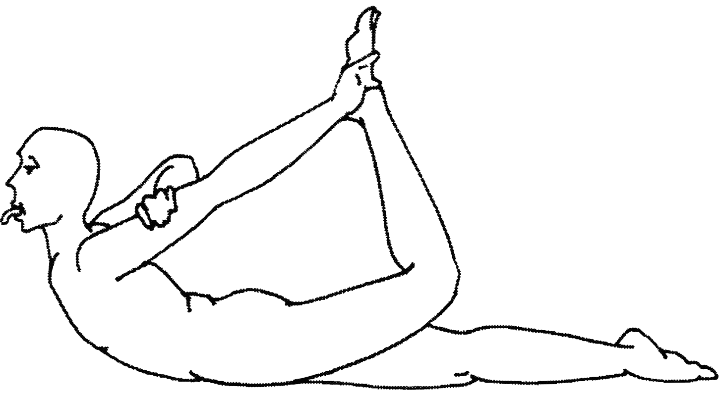 Variante n°1 : Attraper le bras gauche avec la main droite par derrière. S’allonger sur le côté gauche. Agripper les orteils du pied gauche avec la main gauche. Lever le torse et la jambe. Tirer la langue comme un serpent et diriger le regard vers le bout du nez. |