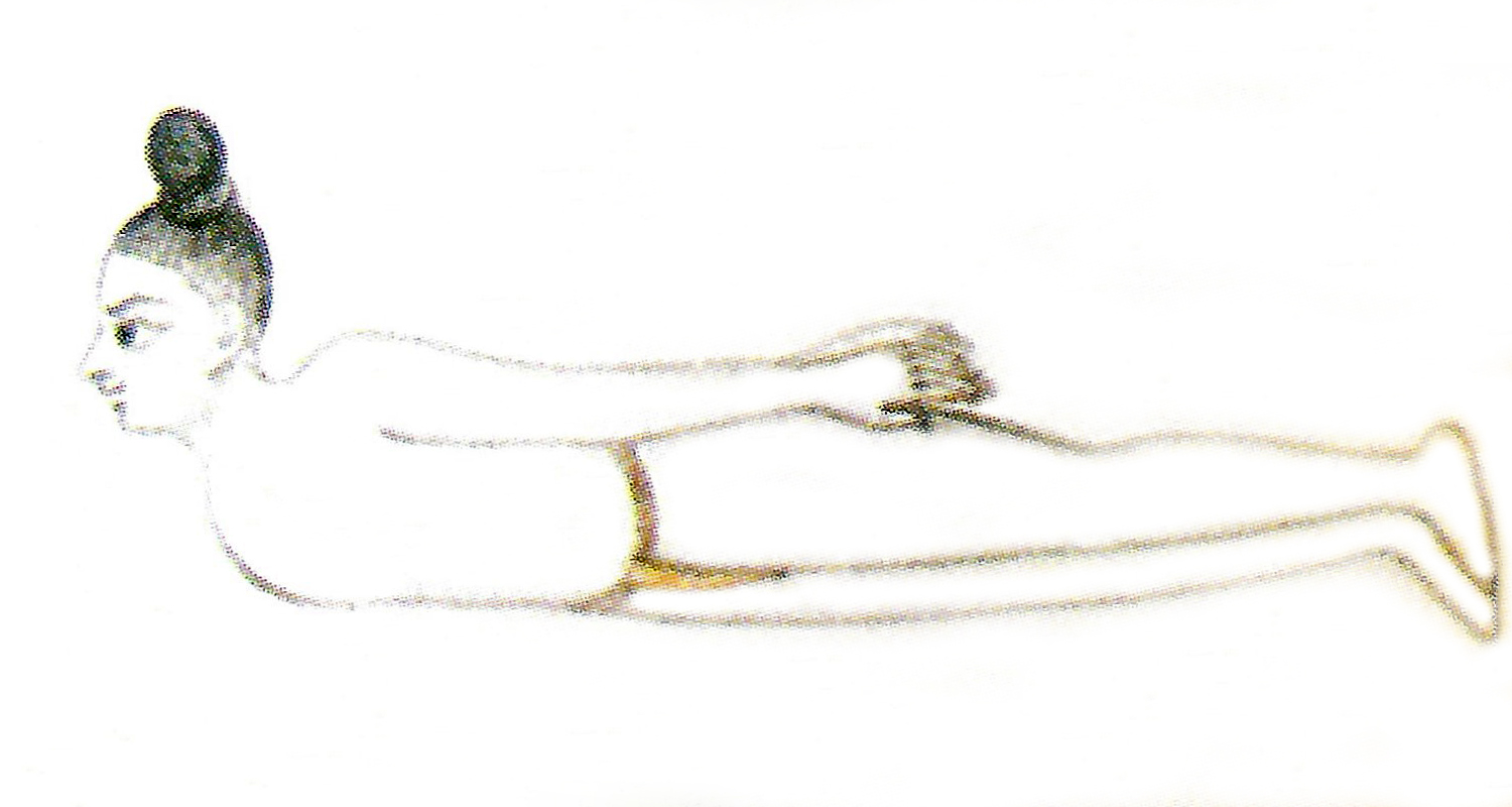 Variante n°3 : S’allonger sur le ventre et lever le torse, les pieds restant à terre. Positionner les mains sur les fesses. C’est la même posture que bhujaṅgāsana (variante n°3). |