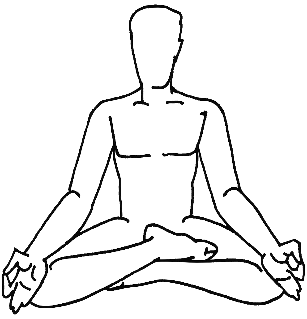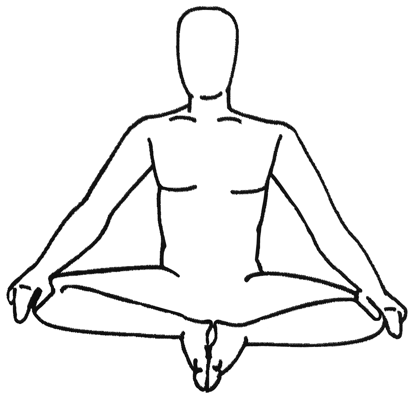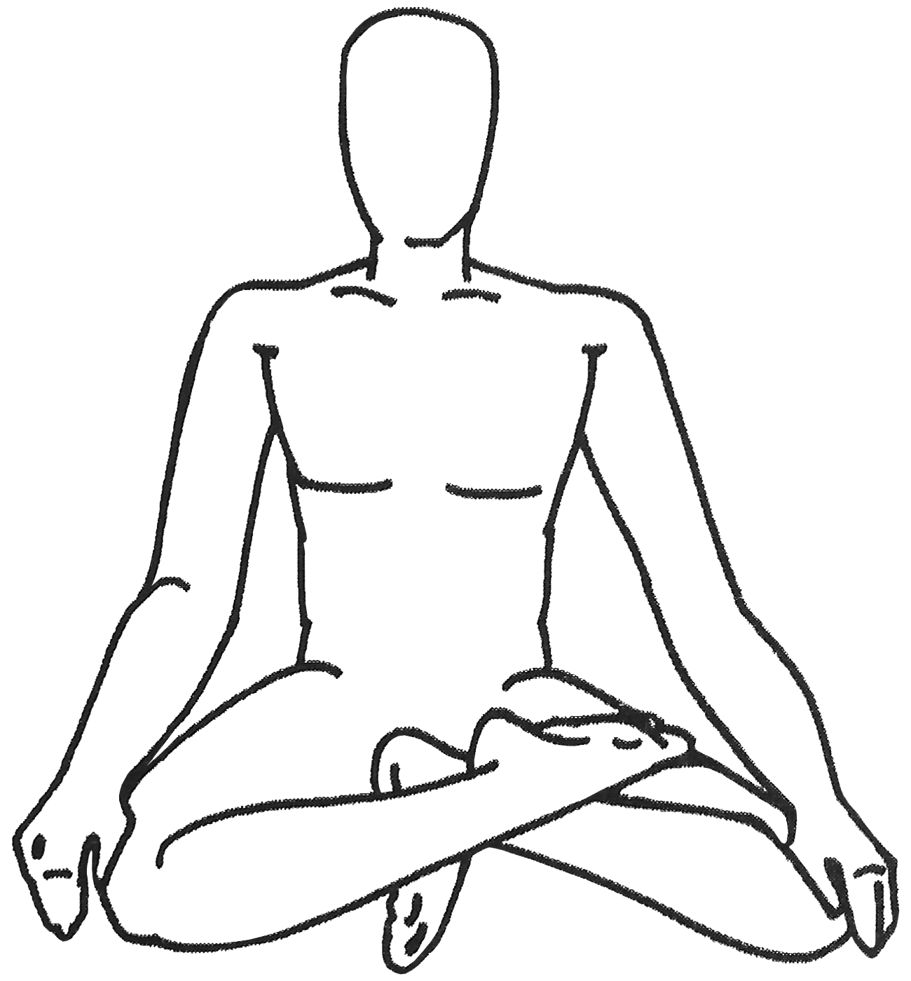 Variante n°1 : Placer fermement un talon contre le périnée. Positionner l’autre jambe par-dessus. Joindre les mains sur le giron, baisser le menton sur la poitrine et fixer le regard entre les deux sourcils. Posture similaire à : vajrāsana (variante n°2). |