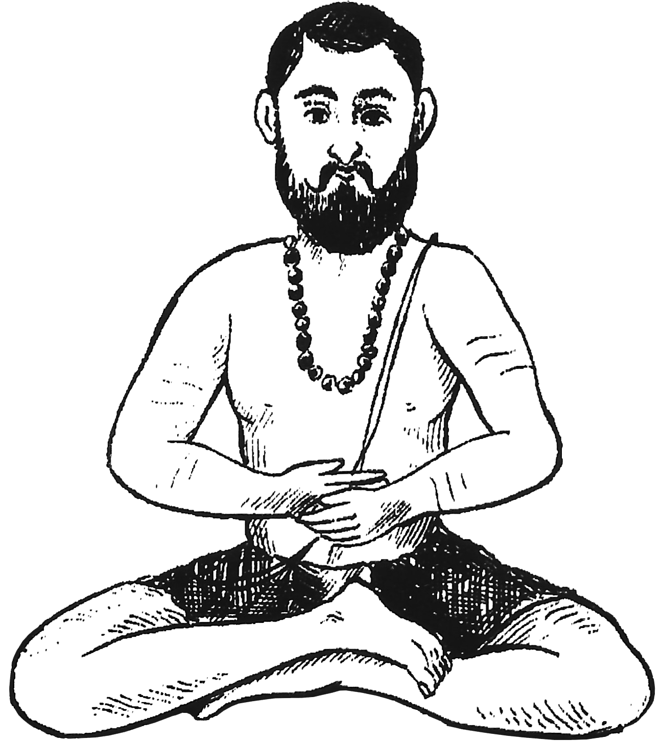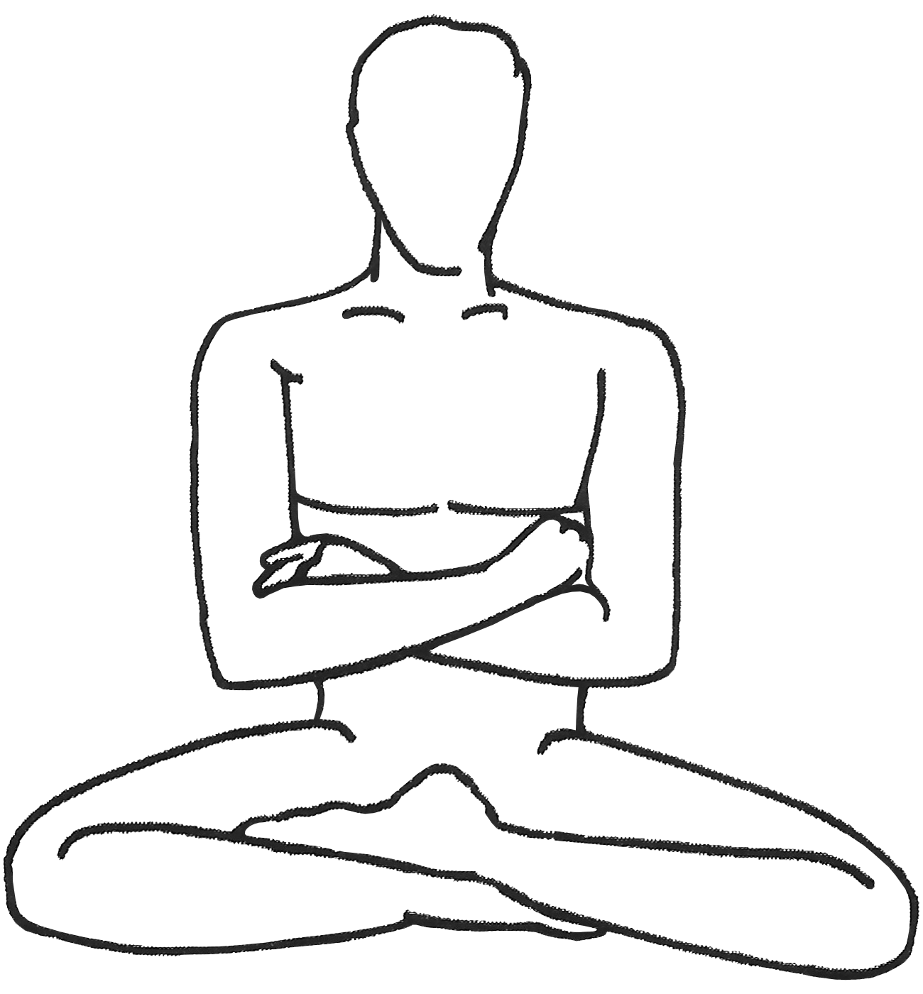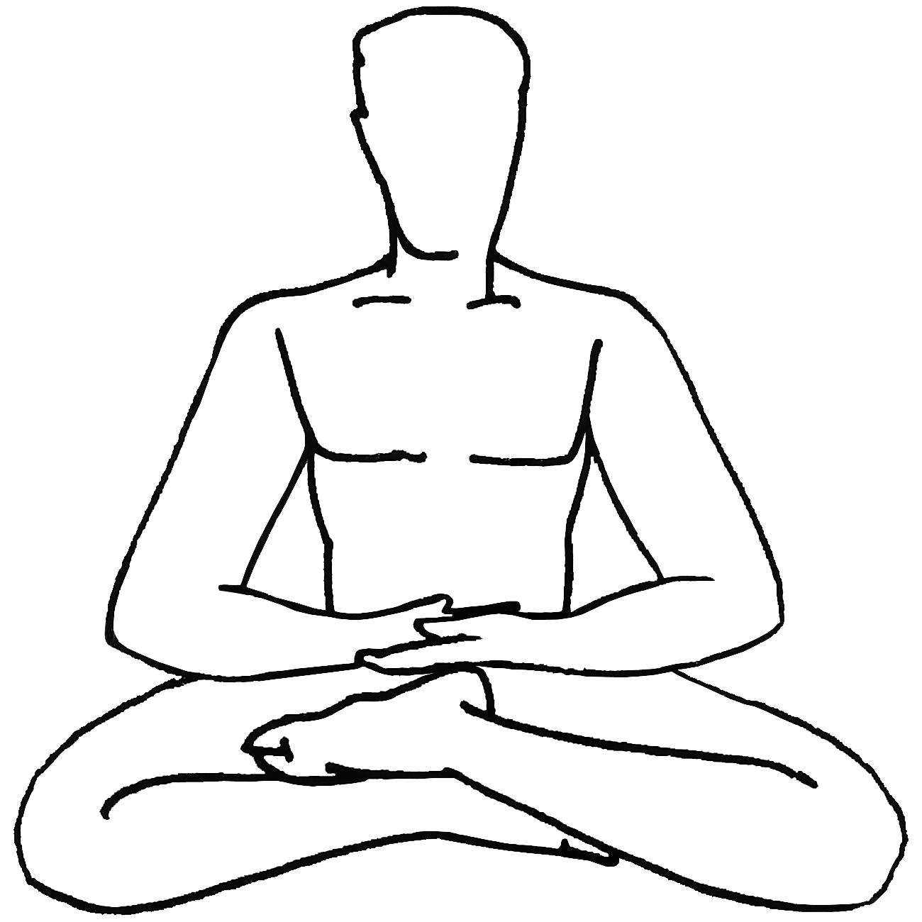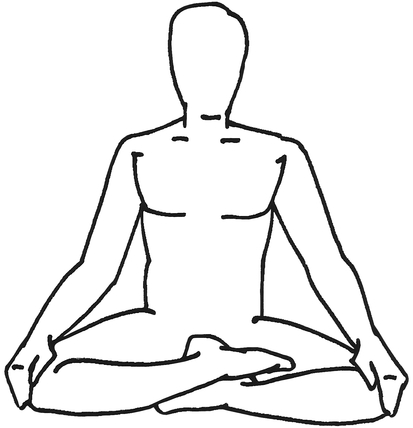 Variante n°1 : Placer fermement un talon contre le périnée. Positionner l’autre jambe par-dessus. Joindre les mains sur le giron, baisser le menton sur la poitrine et fixer le regard entre les deux sourcils. Posture similaire à : vajrāsana (variante n°2). |