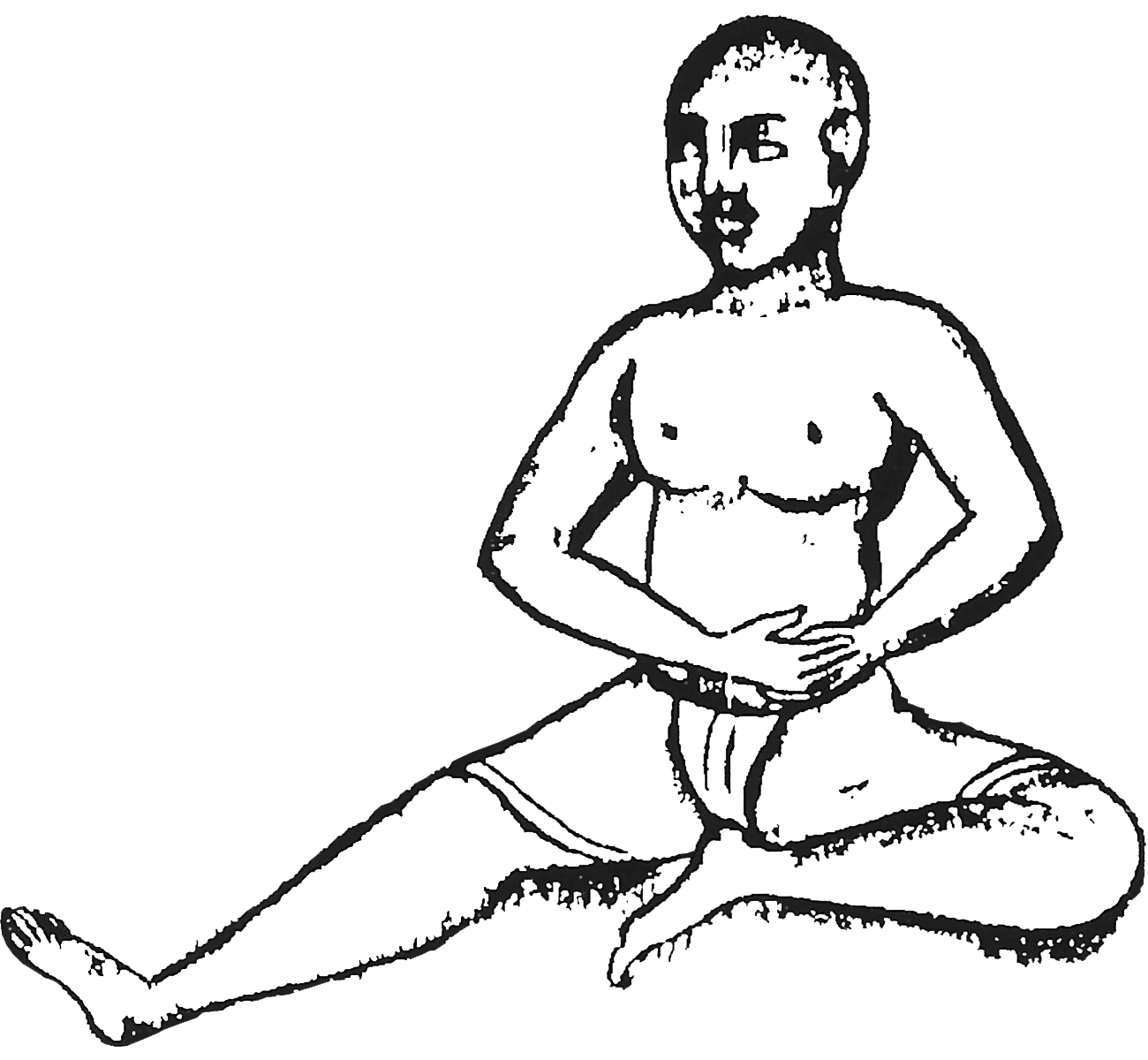Variante n°8 : Le talon gauche presse le périnée, tandis que la jambe droite reste tendue sur le côté. Les mains sont au niveau du nombril. Autres noms : vāma siddhāsana (la jambe droite est tendue) ou dakṣiṇa siddhāsana (la jambe gauche est tendue). |
