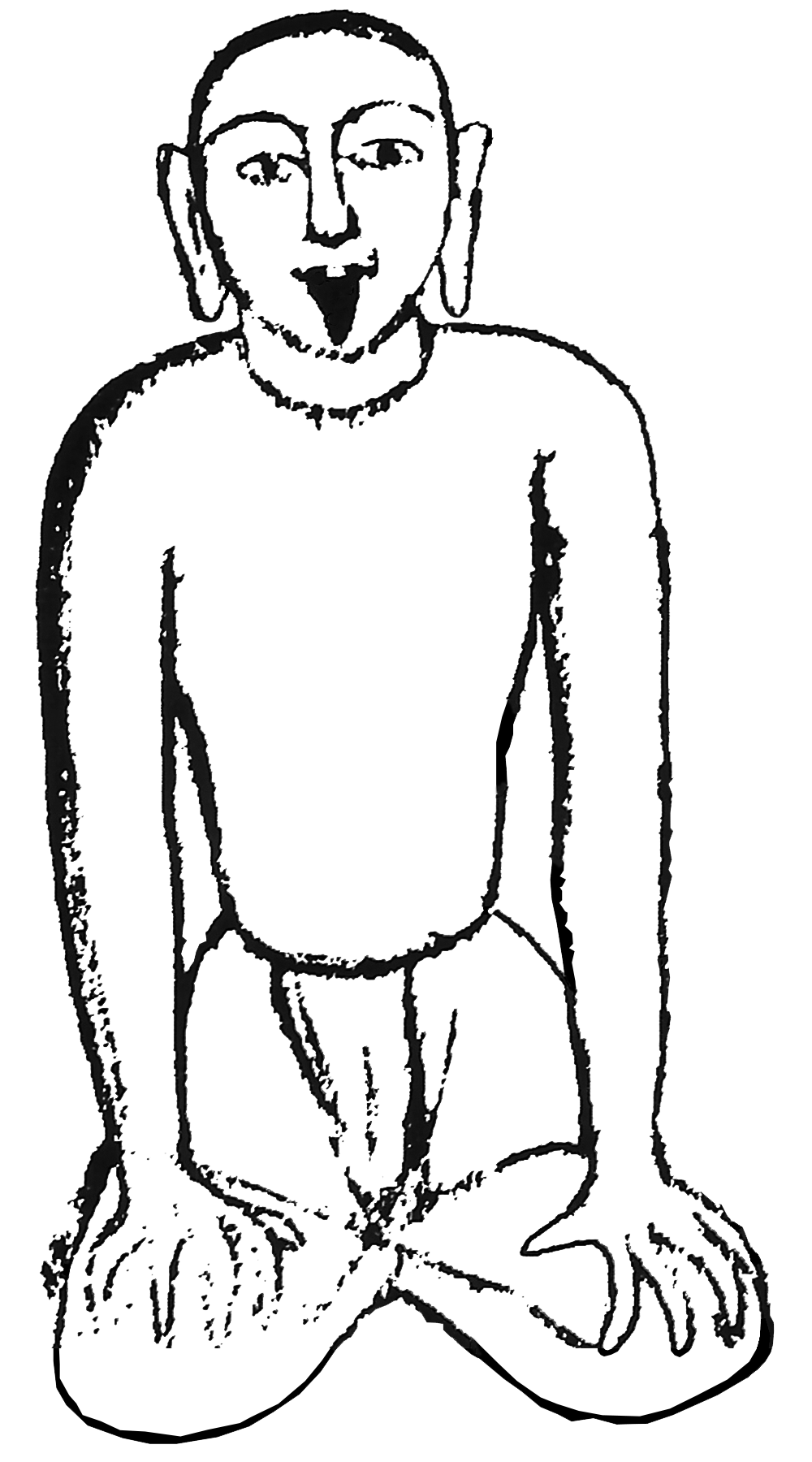 Variante n°1 : Positionner les chevilles sous le scrotum de chaque côté du périnée. Puis placer la paume des mains sur les genoux en écartant les doigts. Ouvrir grande la bouche et tirer la langue. Fixer le regard au bout du nez. |