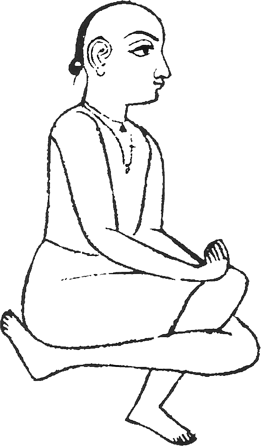Variante n°1 : Placer le pied droit entre la cuisse et le talon gauches de façon à faire toucher les genoux. Positionner le talon gauche sous les fesses. Imiter la forme du lotus avec les doigts, placer les paumes vers le haut et fixer le regard au bout du nez. Autre nom : śukāsana (variante n°2). |