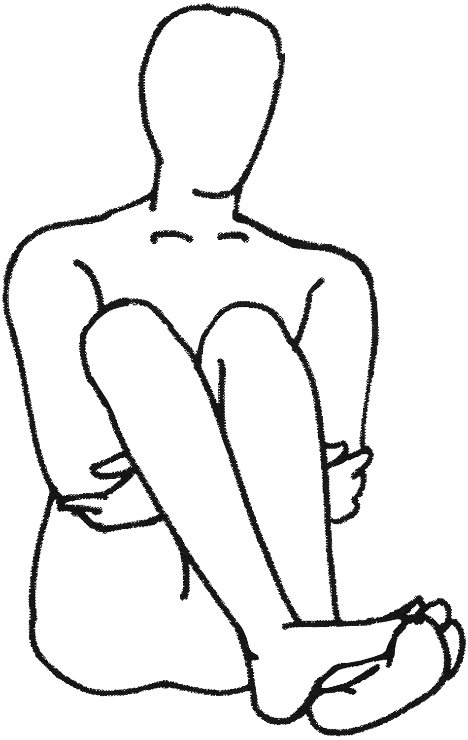 Assis, poser le pied droit sur le pied gauche et tourner les deux pieds vers la gauche, orteils levés. Glisser les mains derrière les genoux et saisir le coude opposé. Se détendre et diriger le regard vers le nez. |