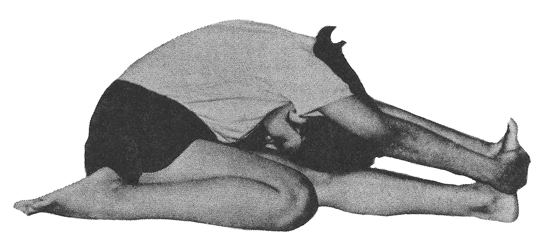 S’asseoir dos bien droit (daṇḍāsana). Plier le genou droit vers l’arrière (comme dans virāsana), en gardant la jambe gauche bien droite, les orteils dressés vers le haut. Lever les bras au ciel. Se pencher vers l’avant, agripper des mains le pied gauche et poser le front sur le genou gauche. Recommencer dans la position miroir. |