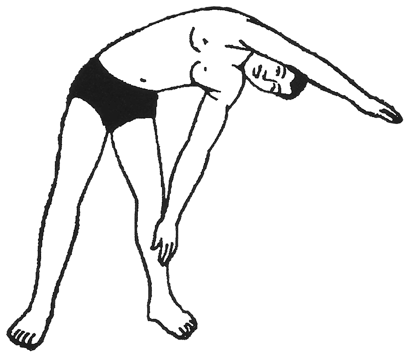 Debout, écarter les jambes. En gardant le buste dans le même plan que les jambes, se pencher vers la gauche et tendre le bras droit dans le prolongement de la tête. La main gauche est posée sur la jambe gauche. Recommencer dans la position miroir. |