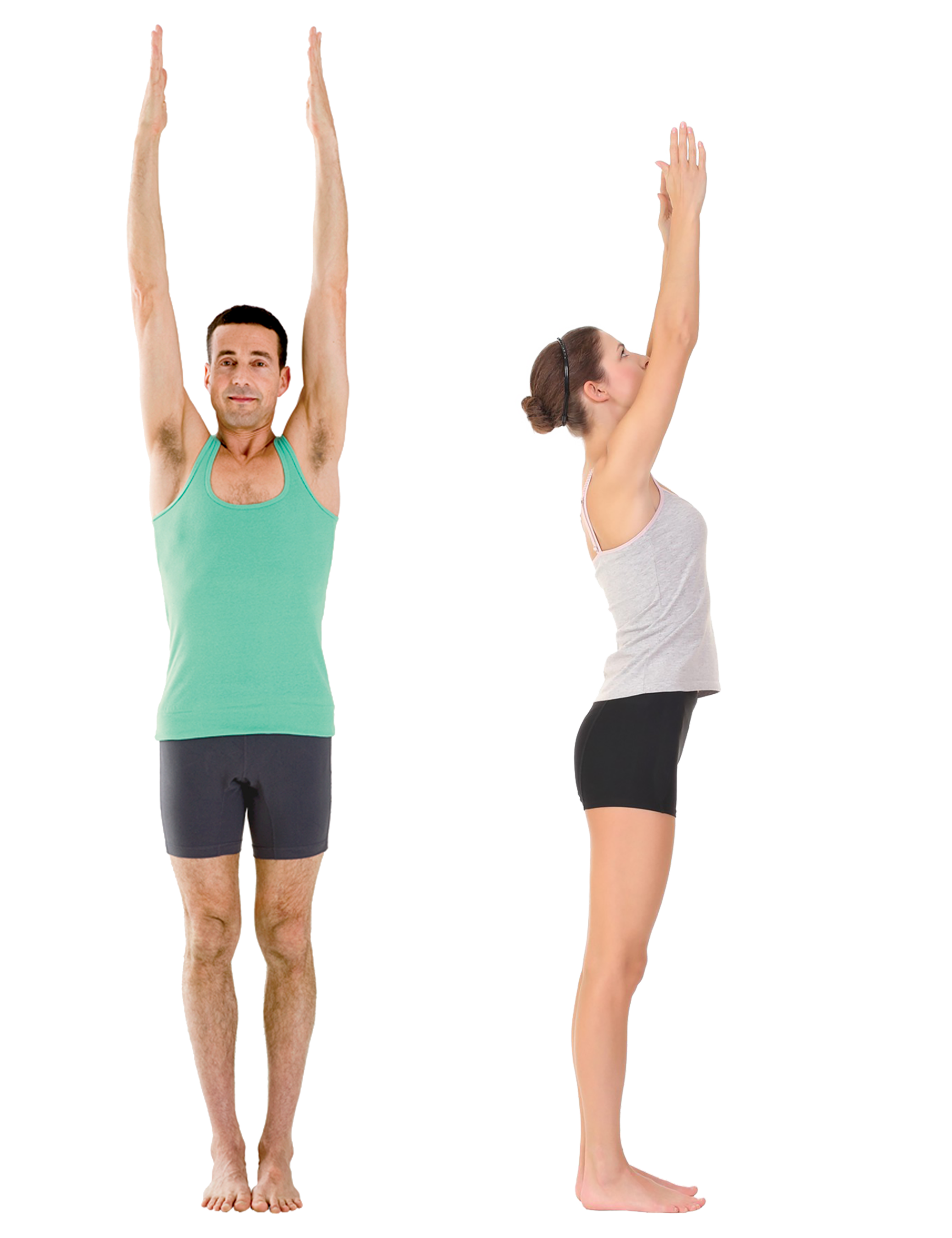 Étape n°2 : ūrdhva hastāsana. Étirer les bras au-dessus de la tête, paumes tournées l’une vers l’autre. Rester bien cambré. |