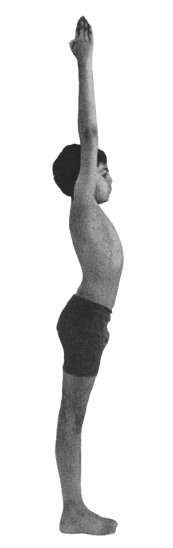 Étape n°1 : tadāsana. Se tenir droit et joindre les pieds : les talons et les gros orteils doivent se toucher. Tendre les bras vers le bas, paumes tournées vers les cuisses. Mettre sous tension les genoux et les épaules, gonfler la poitrine et baisser les épaules. Regarder droit devant. D’autres variantes existent. |