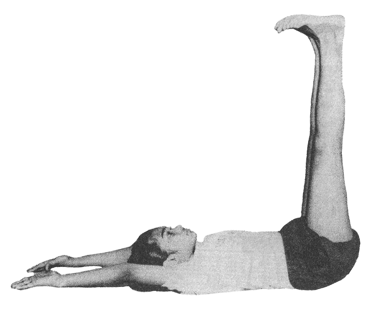 S’allonger sur le dos, jambes tendues et serrées. Tendre les bras derrière la tête, paumes des mains tournées vers le haut. Lever les jambes de 30° et s’arrêter. Les lever de 60° et s’arrêter à nouveau. Mettre les jambes à la verticale et s’arrêter plus longuement. Redescendre les jambes en faisant les mêmes pauses qu’à l’aller. |