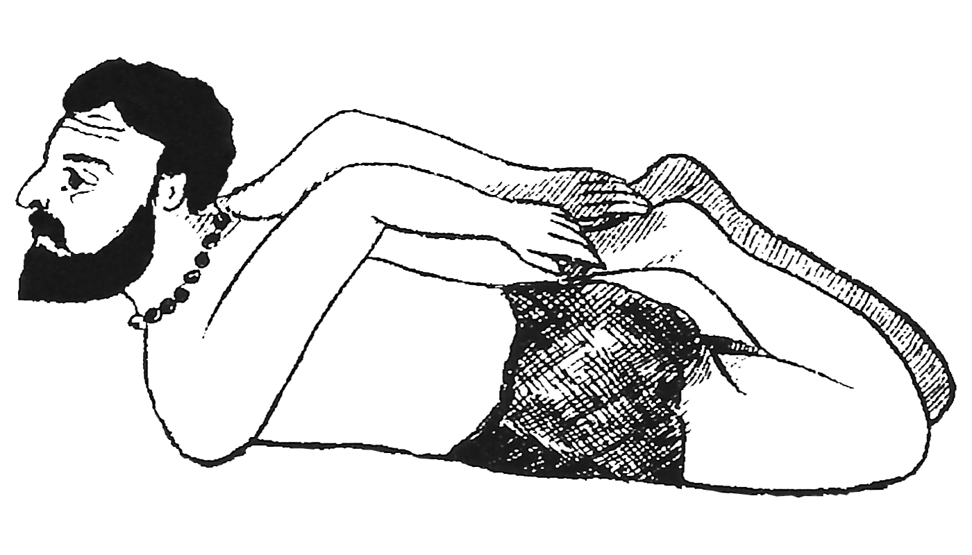 Variante n°1 : Allongé sur le ventre, plier les jambes et prendre les pieds par les mains. Contracter vigoureusement l’abdomen. Lever la tête et contracter aussi la bouche. |