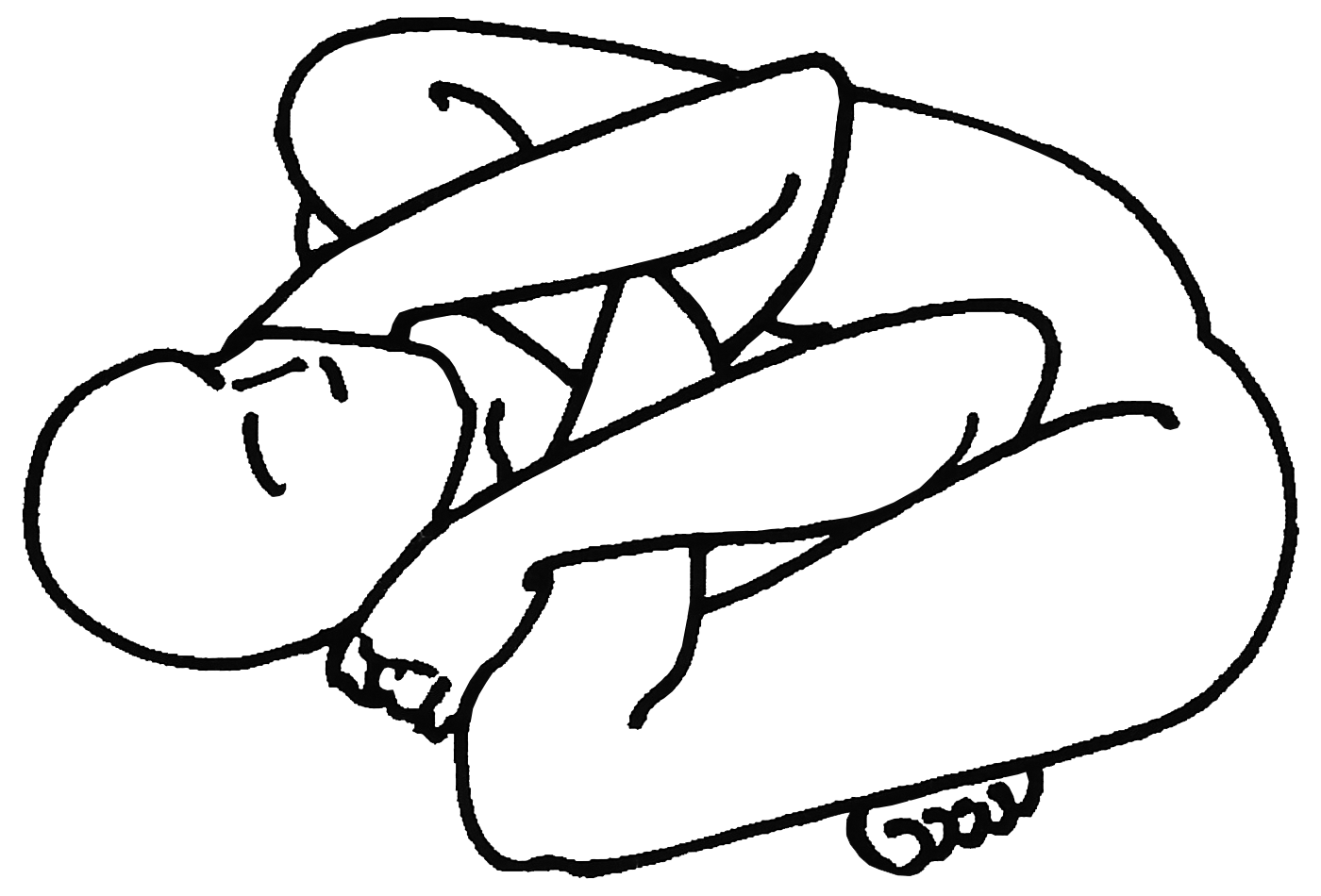 Variante n°3 : S’accroupir puis insérer le bras doit sous le genou droit et venir saisir l’oreille droite. Symétriquement, saisir l’oreille gauche avec la main gauche, le bras passé sous le genou gauche. Assis en équilibre sur les fesses, les jambes pendent alors dans le vide. Autre nom : garbhāsana (variante n°5). |
