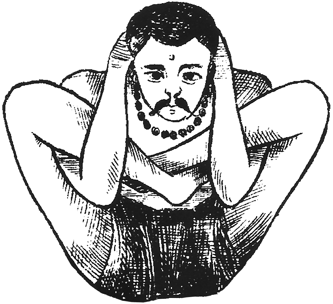 Variante n°1 : Se mettre d’abord en position du lotus (padmāsana). Placer la paume des mains au sol en insérant les bras entre les cuisses et les genoux. Puis venir prendre le cou avec les mains et s’allongeant sur le dos. En position assise, cette posture s’appelle granthibhedanāsana. |