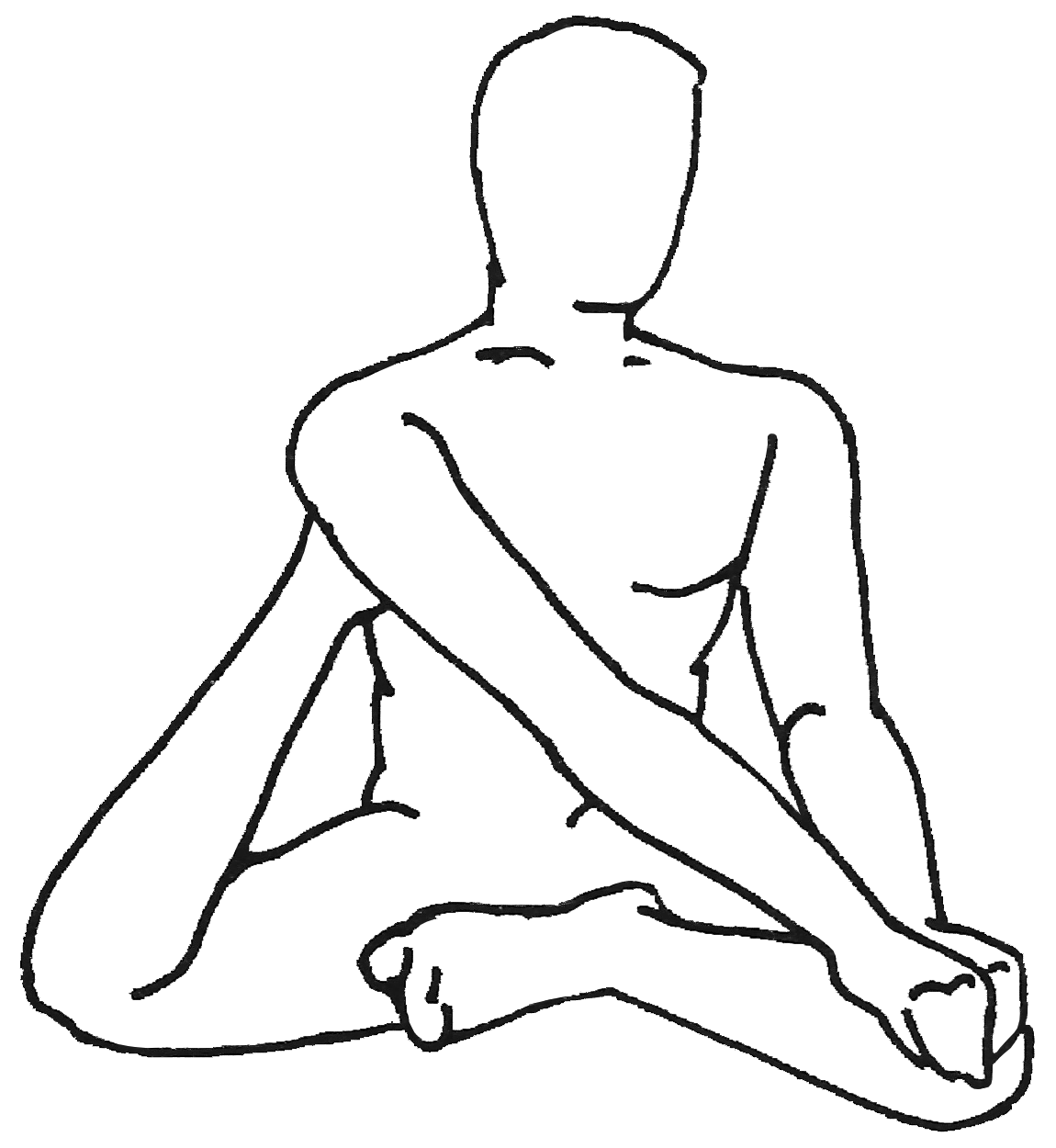 Rapprocher le talon de la jambe gauche vers le bassin, puis caler la jambe droite sous l’aisselle droite ; poser la paume des deux mains sur le genou gauche. Diriger le regard vers le bout du nez. |