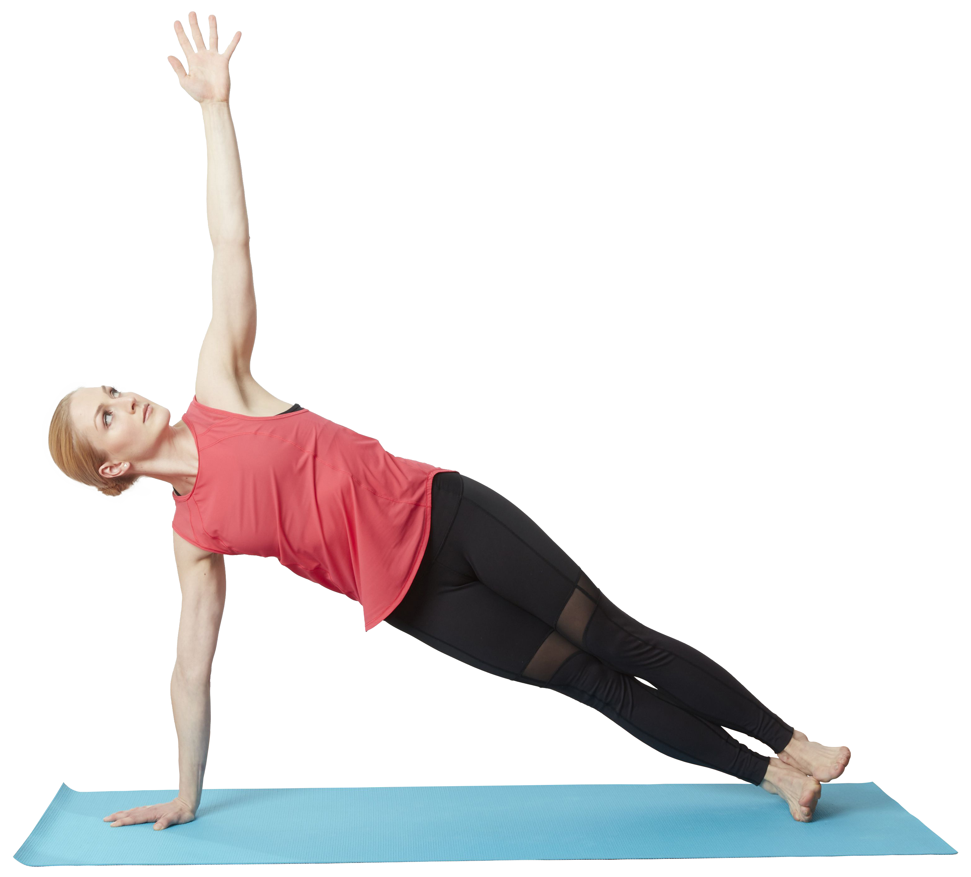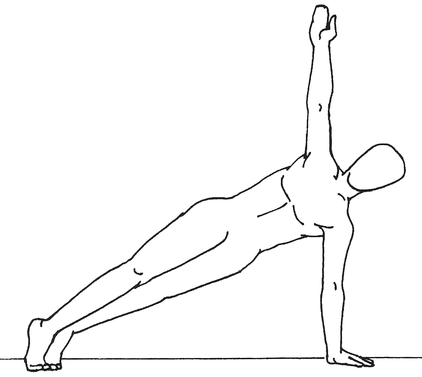 Variante n°2 : S’allonger sur le côté. Lever le buste à l’aide d’une main. Tourner l’autre main vers le ciel, ainsi que le visage. |