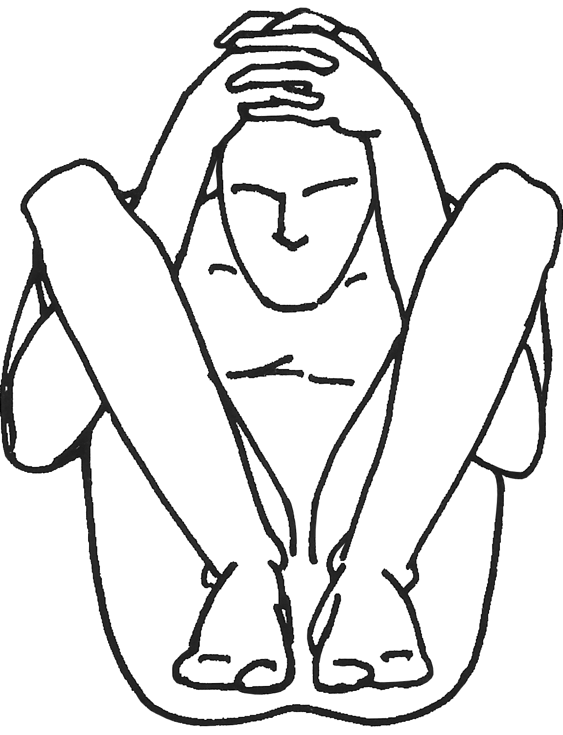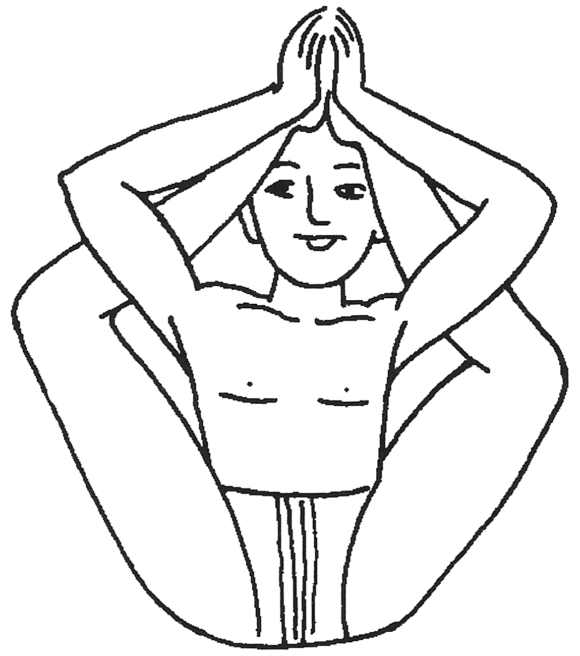 Variante n°3 : S’asseoir par terre puis insérer les mains derrière les genoux par l’extérieur, poser les paumes sur la tête et croiser fermement les doigts. Laisser pendre les jambes depuis les épaules. |