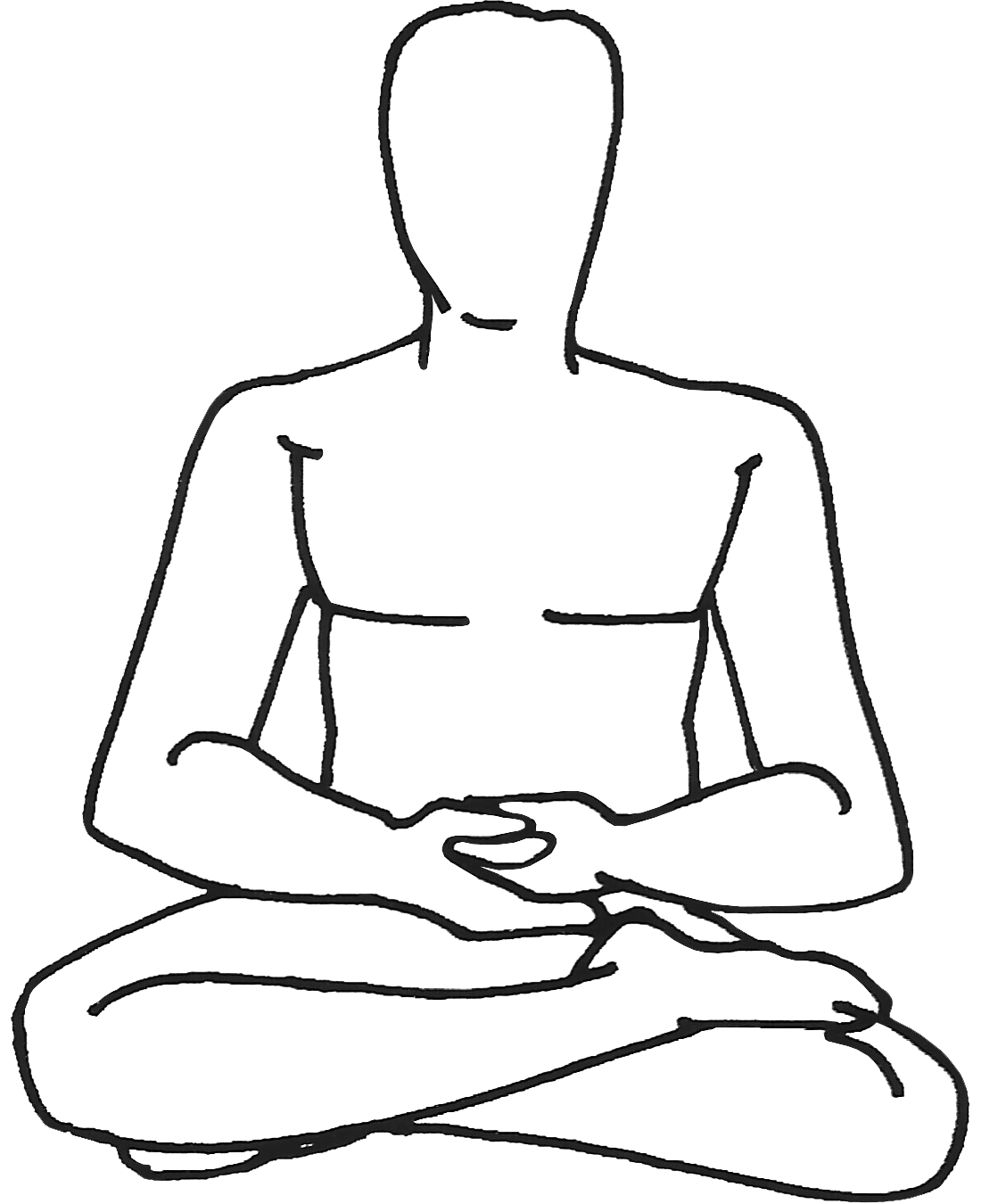 Assis, placer le pied droit sur le genou gauche et le pied gauche sous le genou droit. Mettre la paume de la main gauche sur celle de la main droite et positionner les mains au-dessus du pubis. Le regard est dirigé sur le bout du nez. Autre nom : vīrāsana (variante n°1). |