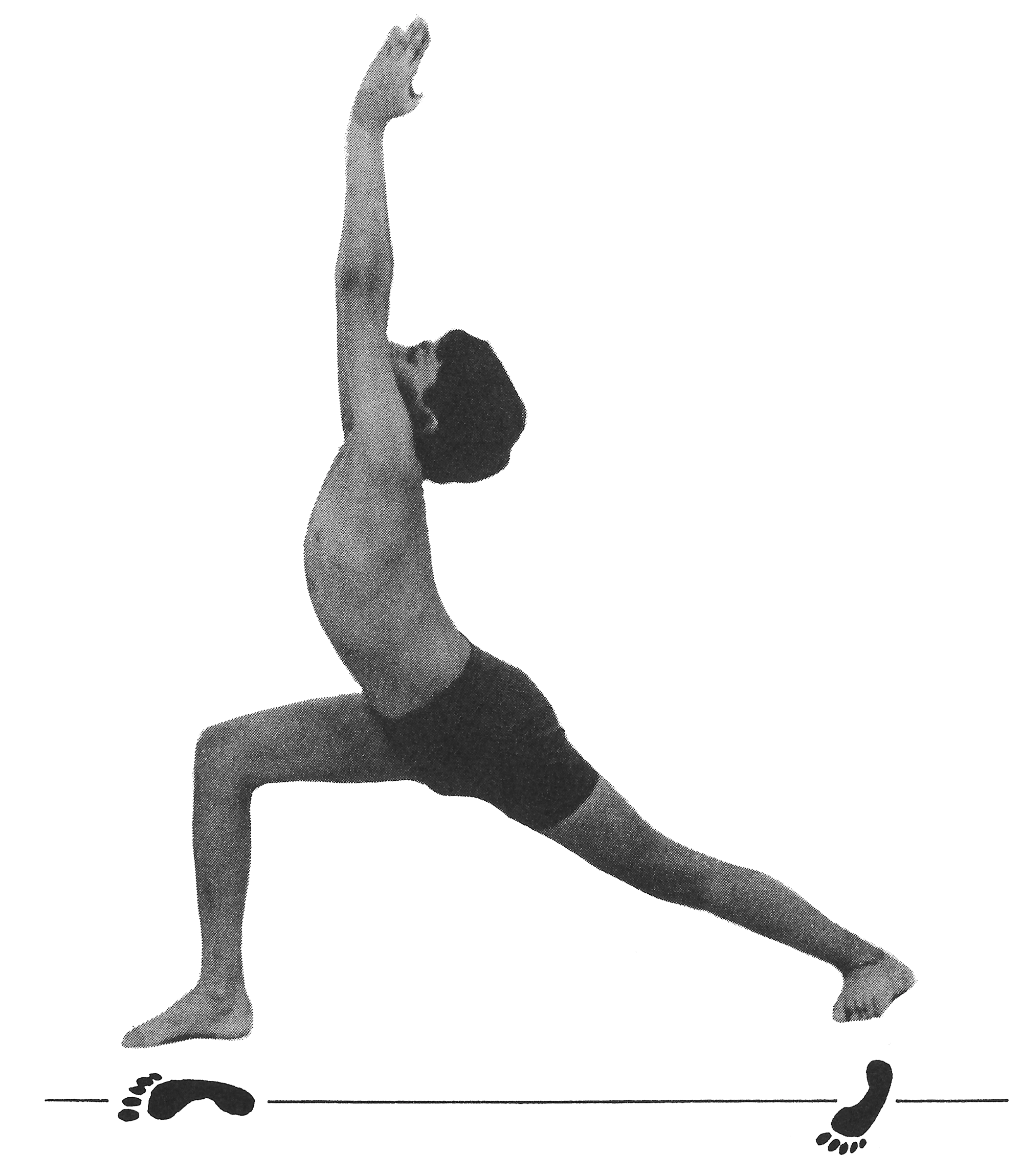 Variante n°1 : Se tenir debout (tāḍāsana), les mains le long du corps. Sauter et écarter les jambes d’environ 1 m en écartant aussi les bras à l’horizontale, paumes tournées vers le bas. Joindre les mains en les tournant vers le haut et en levant les bras sans plier les coudes. Tourner le pied droit de 90° et le pied gauche de 45°. Se cambrer et tourner le buste vers la droite. Plier le genou droit en gardant la jambe gauche bien tendue. Diriger le regard vers le bout des doigts. Recommencer dans la position miroir. |