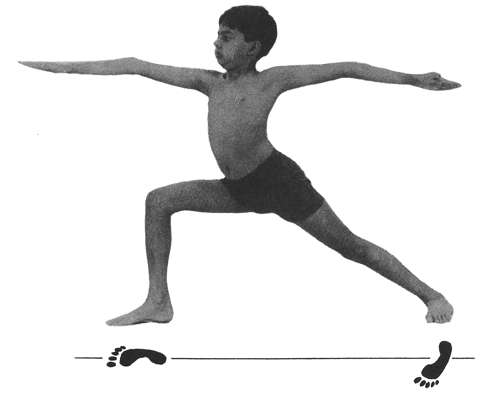 Variante n°2 : Se tenir debout (tāḍāsana), les mains le long du corps. Sauter et écarter les jambes d’environ 1 m en écartant aussi les bras à l’horizontale, paumes tournées vers le bas. Tourner le pied droit de 90° et le pied gauche de 45°. Tourner le buste vers la droite. Plier le genou droit en gardant la jambe gauche bien tendue. Diriger le regard vers le bout des doigts de la main droite. Recommencer dans la position miroir. |