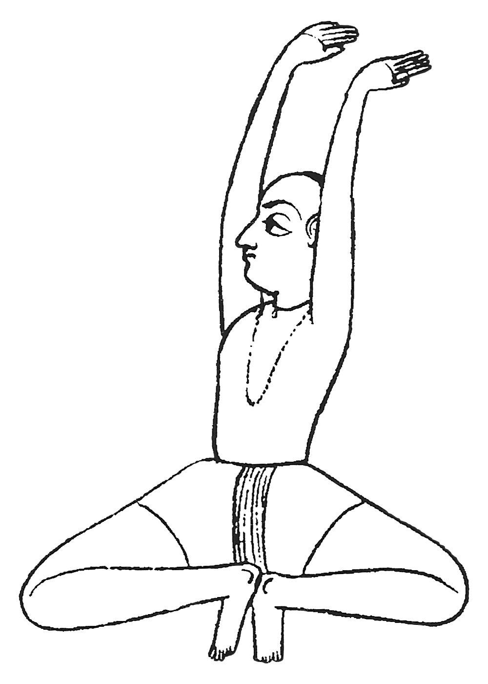 Rapprocher les deux jambes et les placer sous l’anus, tout en maintenant les talons légèrement espacés ; les genoux sont écartés et les doigts de pied touchent le sol ; lever les deux bras les paumes tournées vers le haut ; diriger le regard vers le nez. |