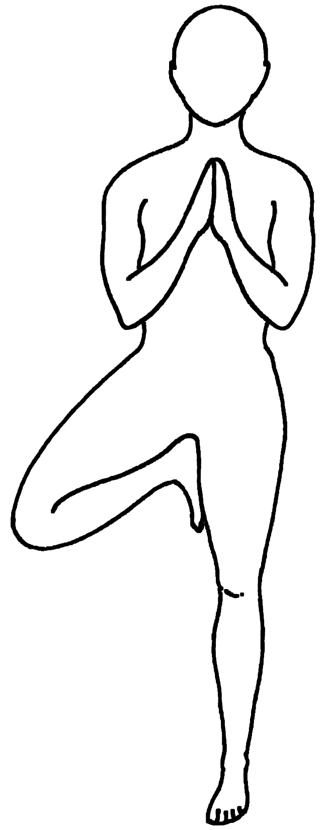 Variante n°1 : Se tenir debout, bien droit. Lever le pied droit et placer son talon à l’aine gauche. Se tenir fermemnt comme un arbre. Autres noms : ardhacandrāsana, ardhapādāsana, ekapādāsana. |