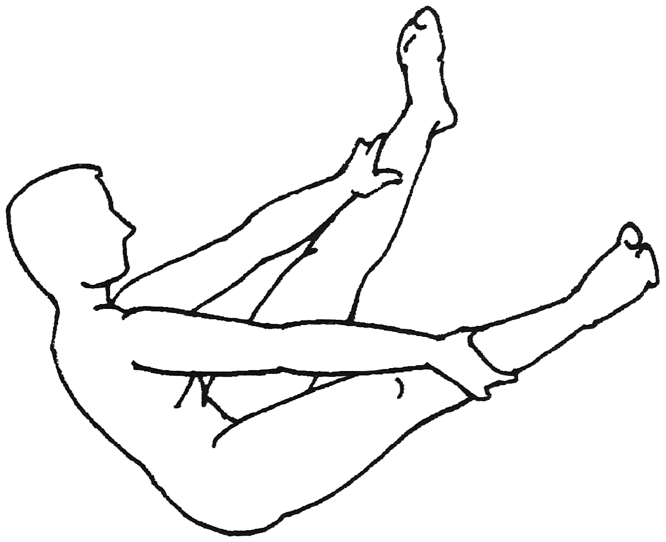 Variante n°1 : À partir de la position allongée, se redresser pour attraper les chevilles avec les mains ; puis écarter les jambes et lever la tête. Le regard se concentre sur les sourcils. |