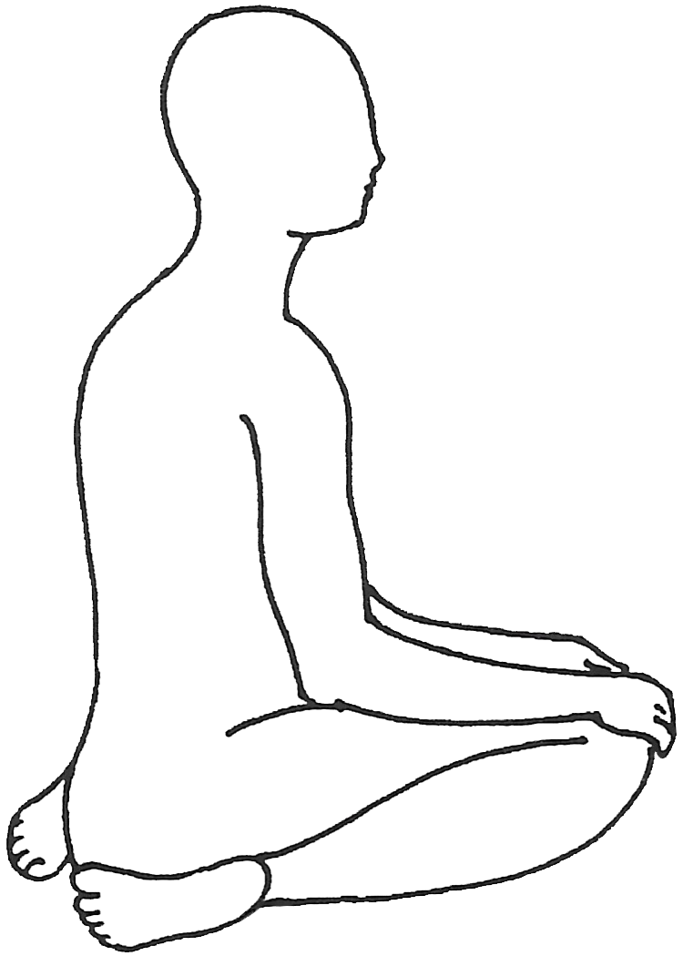 Variante n°2 : S’asseoir sur les jambes et poser les mains devant sur les genoux pliés. Diriger le regard entre les sourcils. Même posture que gandharvāsana et vajrāsana. |